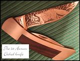 Subsequently my interest in Aurum Etchings grew and as my collection grew I was gradually able to gather more information about the company and it origins and what made Aurum Etchings unique. It also occurred to me that these same Aurum Etched knives would have cost me many thousand of dollars each if they had been individually engraved by hand but due to a process that Aurum Etchings had largely if not entirely revolutionised back in the early 70s the same could be had in some cases for even a few hundred dollars. In fact the very first Aurum knife produced by Aurum Etchings before they began the process is seen here below, it was done by Samuel Shortes on his kitchen table with the barest minimum of tools prior to setting up there facility, it was incredibly time consuming and not a cost effective method if these were to be had at price most could afford.