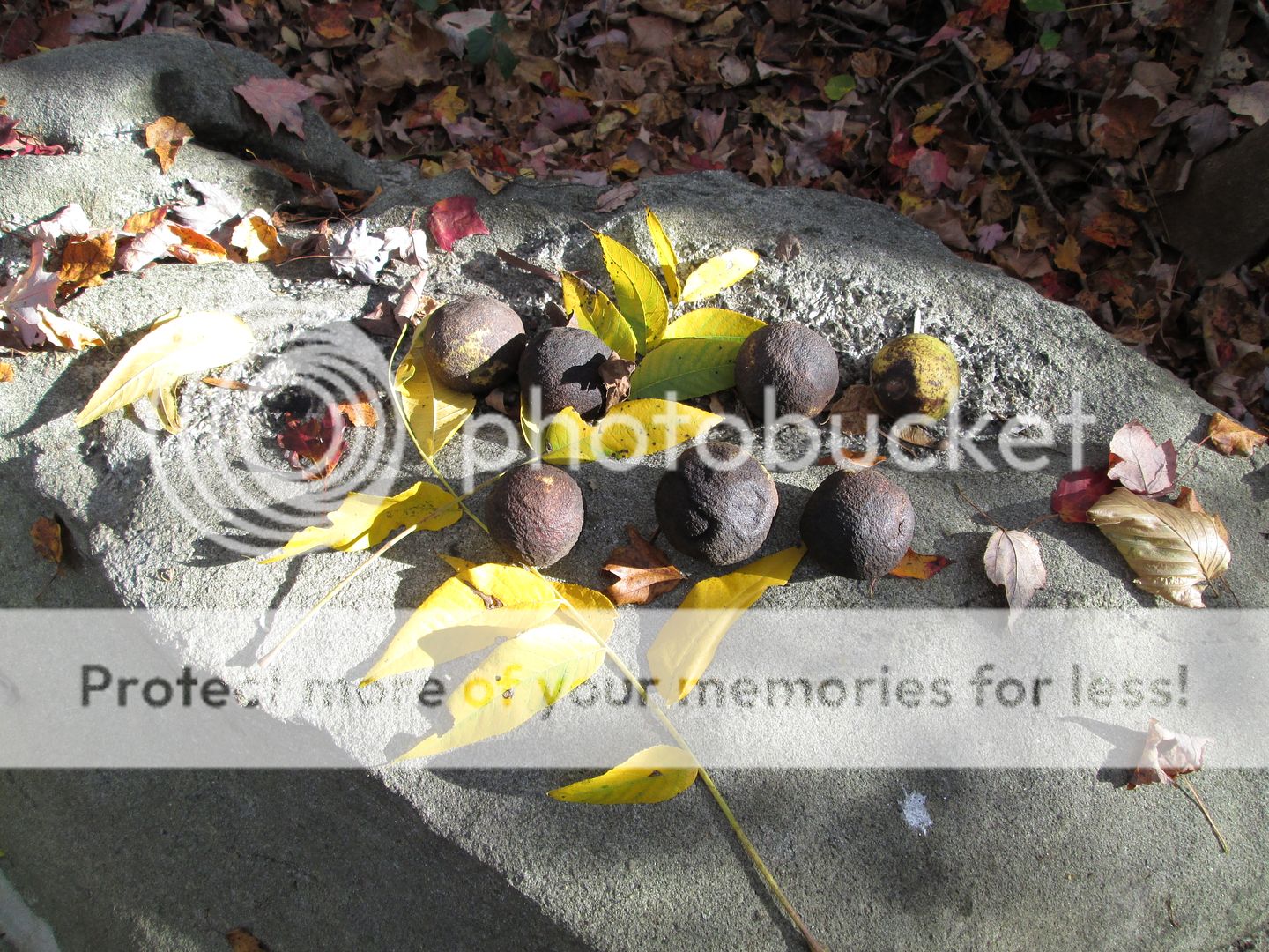 Tons of hickory nuts. These are another high source of calories that wouldn't be overlooked. One of the few sources of fat in the woods that doesn't run, fly or swim away. Like the Black walnuts the outer husk turns black as they ripen but hickory nut husks are sectioned, falling away much easier.