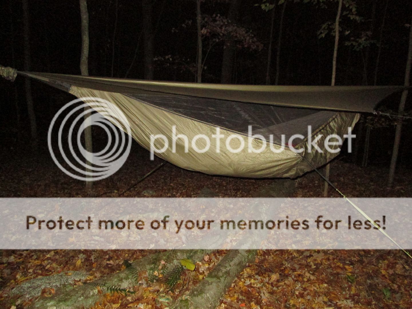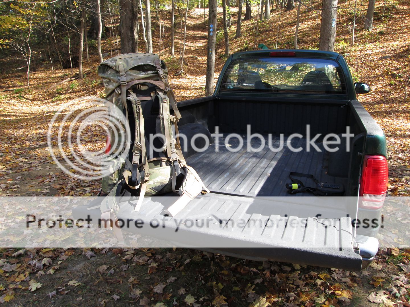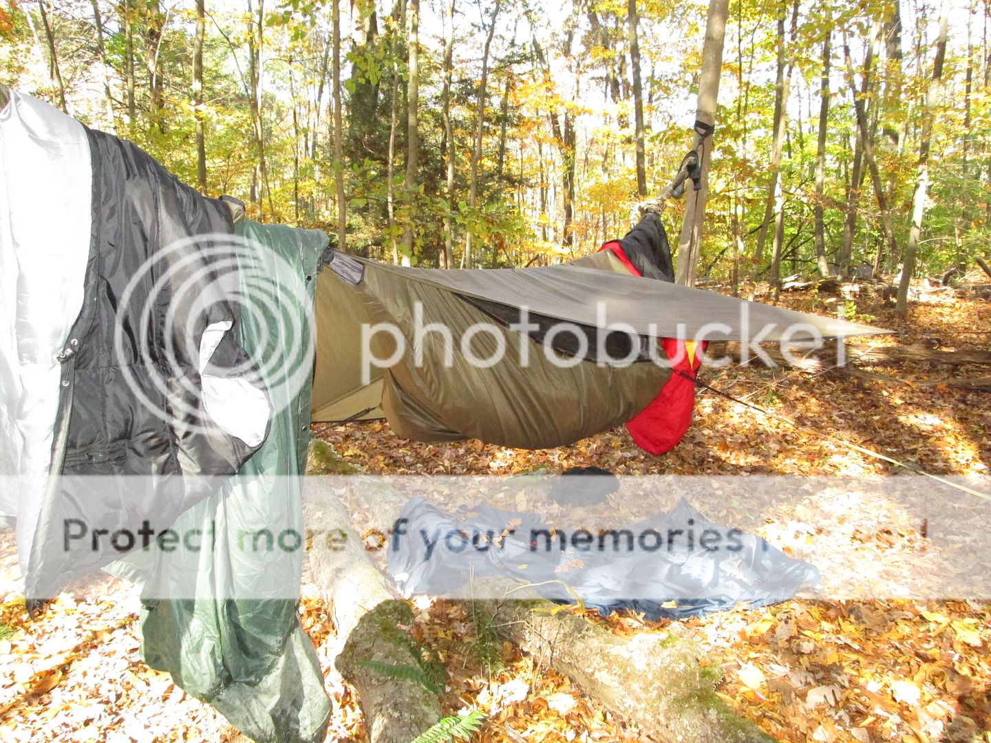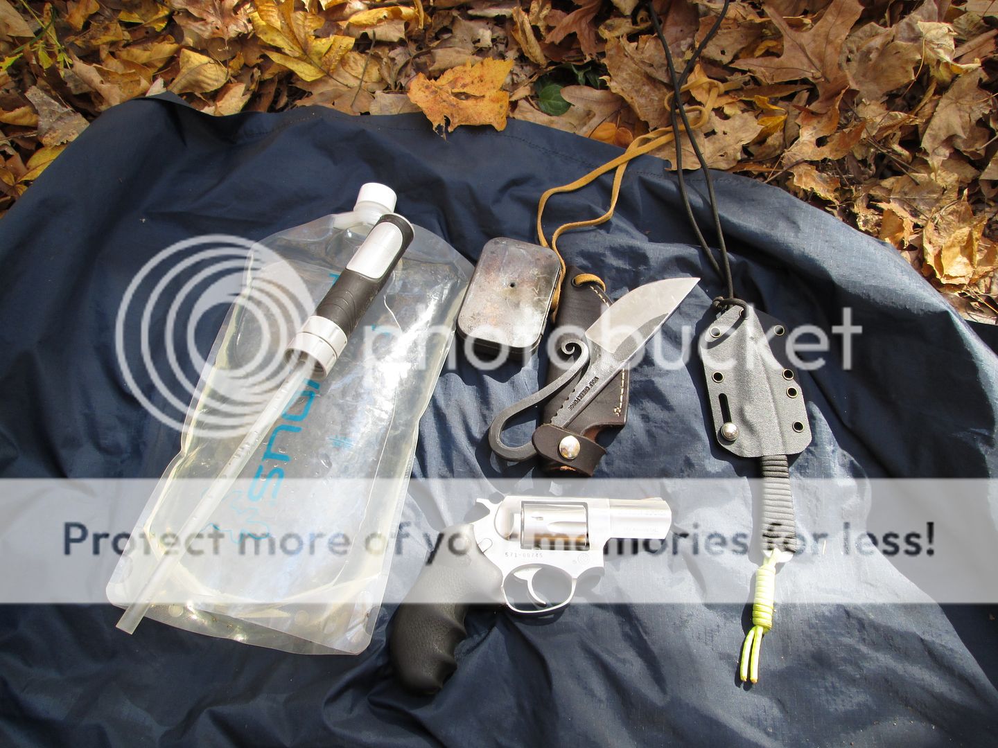 I would also have to find the materials needed for marginal firecraft. The only packed method for firestarting would be my knife, chaga and an empty Altoids tin. Backup would be a bowdrill but that would have to be made during the trip if time allowed. To increase my chances of fire the next day I would start a fire chain by charring natural materials. I would bring a shelter and sleeping bag. Kifaru EMR loaded with Hennessy hammock plus super shelter undercover and pad, GSI SS kettle, 2 empty Platy bags, 1 empty Nalgene canteen, ziploc bags, a few small knives, Frontier pro filter straw, plastic cup, extra shirt, Golite poncho, Down-V bag,headlamp, fleece jacket, ground cloth and a few other odds and ends.