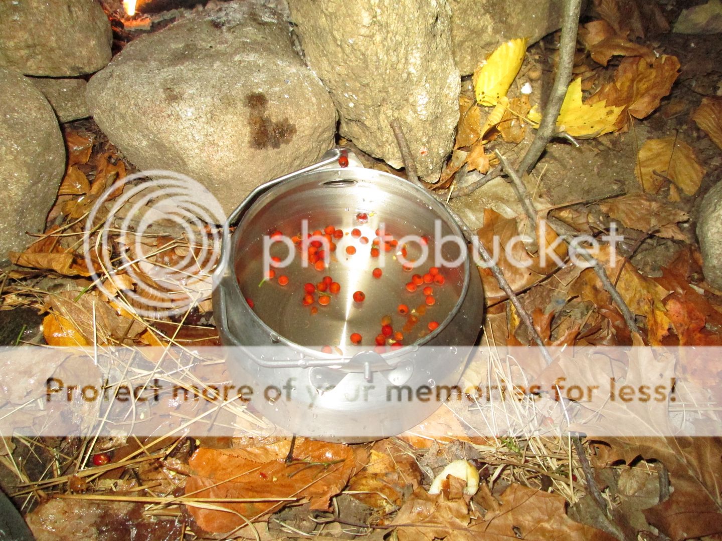 So let's take a look at what the day's gathering/foraging netted. Not bad. I drank the Nalgene canteen during the day but still had two 70 ounce Platys filled. There was water, food, and stuff for fire. There were also some failures. I didn't catch a trout or any other fish. I didn't find any grapes beyond some hopelessly shriveled up ones. I didn't find any wild scallions despite being sure some would turn up. Partridge berries were MIA, found the plants but not the berries. No great loss there. The conifer needles simply slipped my mind. Again no great loss. When it comes to foraging things can be hit or miss. I have done outings like this before making the mistake of waiting to gather water. I can go a looong time without food but running around without water makes me droop like a plant. Making that a priority put a good spin on everything this time.