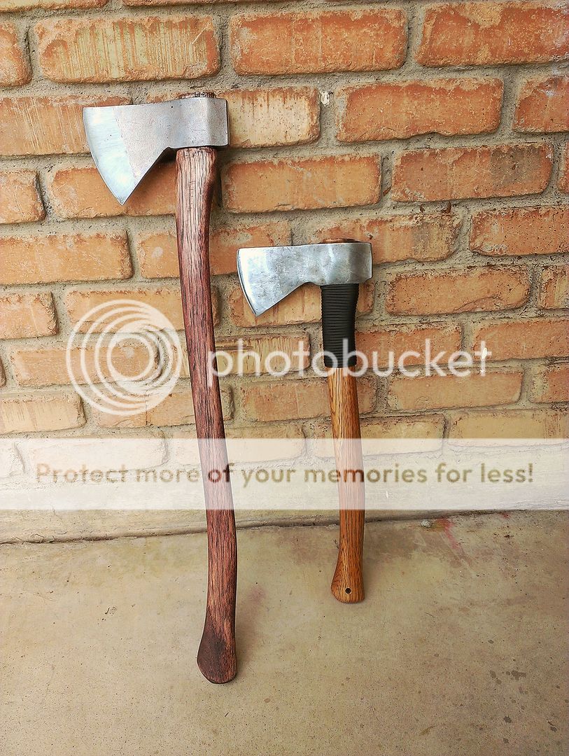 Here are my Harbor Freight Firemans hatchet and axe. Both started off as the Hatchet model. They are now AWESOME users. Steel is good, holds a really sharp edge through hard use. Needed a lot of work straight out of the store but for $20 invested on the short one, and $33 invested on the longer one, well worth it.