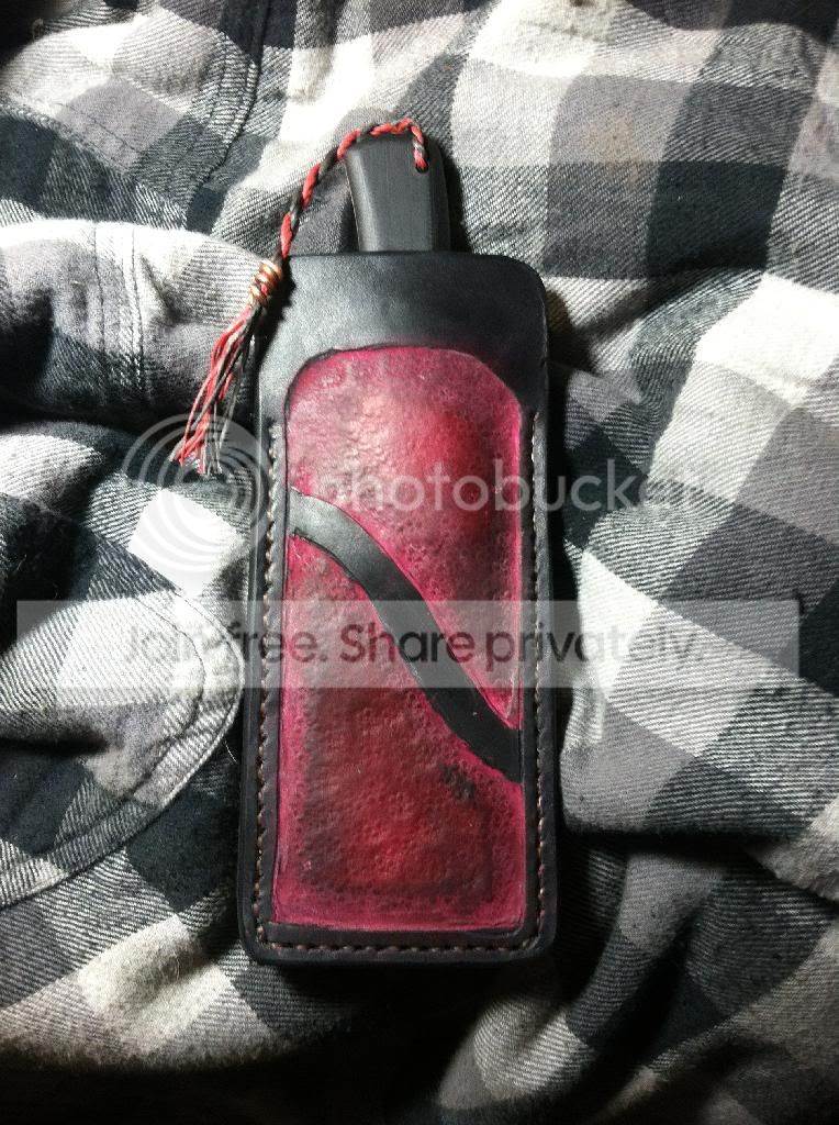 Sheath-Hand-stitched cow hide. Stamped with "stingray" matting stamp. Dyed "Ox-Blood" and Black