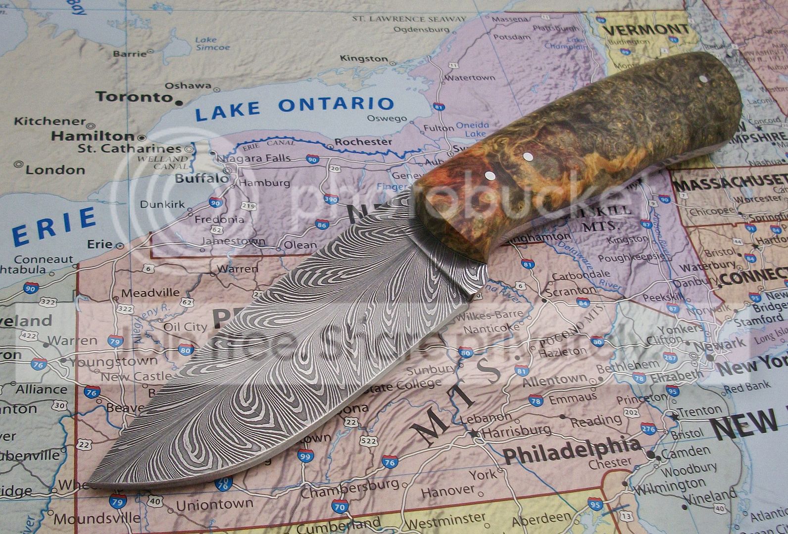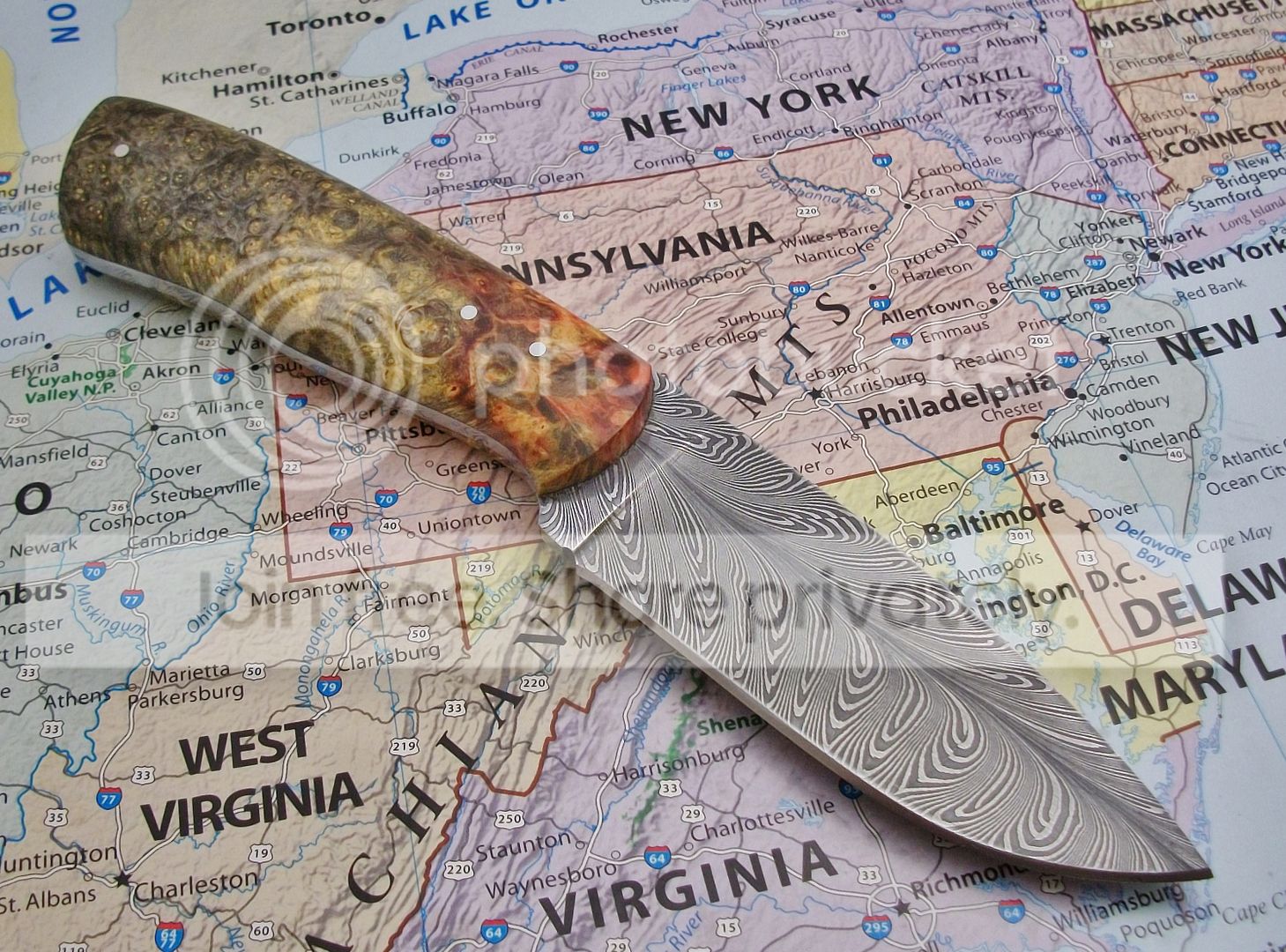 STEEL: L.FOWLER {FINE FEATHER PATTERN DAMASCUS} 1095/15N20 ~ TOP BEVEL, THIS ONE IS CARRYING A "BIRTH MARK" ON THE ONE SIDE..THE SMALL BLACK SPOT U SEE ON THE BLADE IS A TINY PIT FROM THE FORGING OF THE STEEL,I DIDNT EVEN SEE IT TILL I WAS DONE HAND SANDING IT AFTER THE SECOND ACID BATH..IT DOESNT HURT THE FUNCTION OF THIS KNIFE,IF YOU