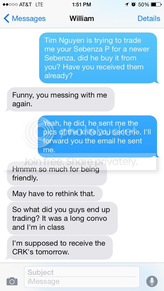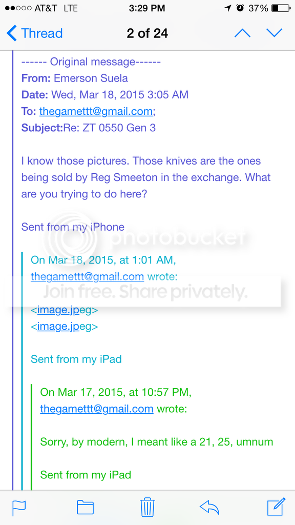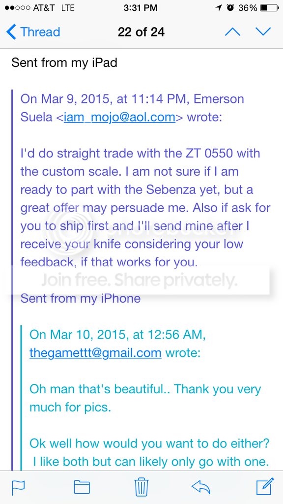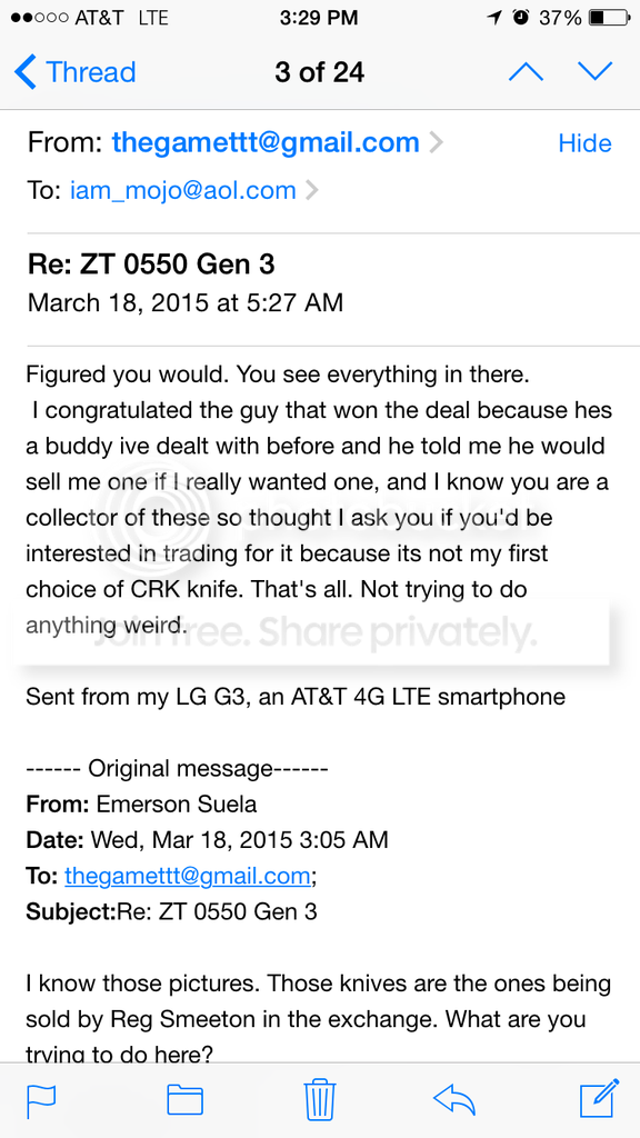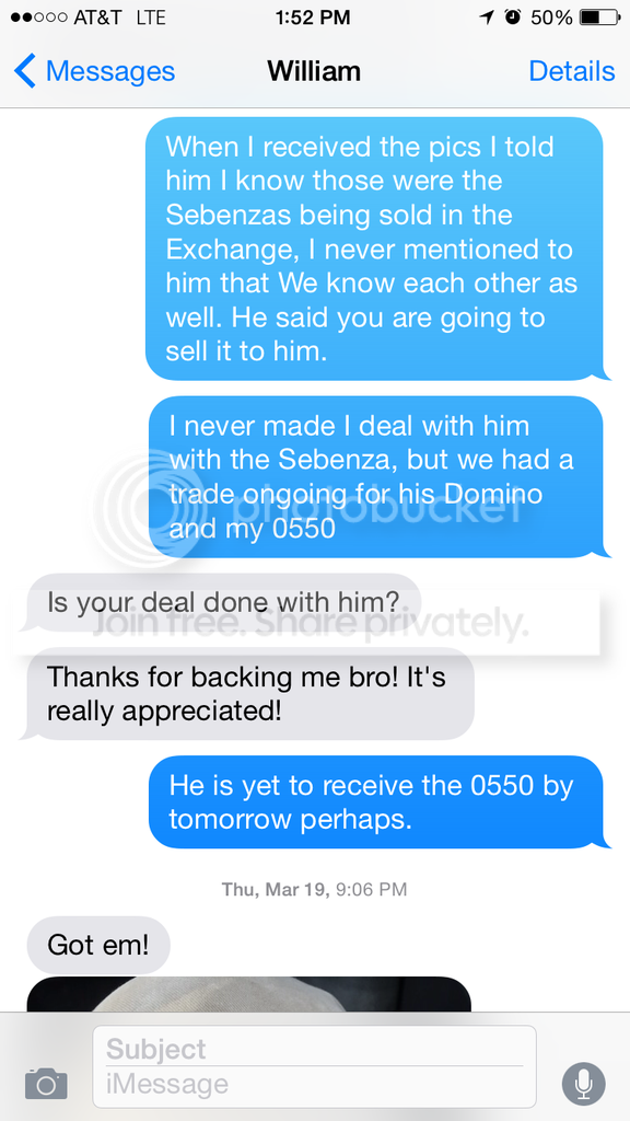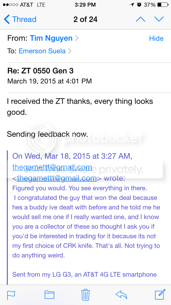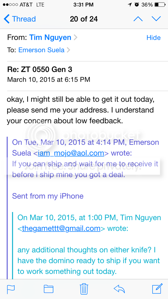 i dealt with eowyn once and probably won't again. His communications are subpar imo. I traded him a domino for a zt550, all communications were prompt up until we agreed to trade. then he went dark for almost 2 days. then when he finally answered he answered like 1 out of 5 questions. It was like pulling teeth to get him to answer questions. He also made me ship first despite having positive feed back here and tons on other forums. Don't care about that part too much, but long story short I did end up getting the deal completed, but it was not a very smooth experience. took forever to get all the info I needed. Considering how paranoid he was about me being a fairly new member I did all I could to ease his mind by explaining thoroughly the additional fedex requirements(I ship fedex only for security purposes, been burned one too many times with usps). Took him an additional 2 days to answer each question I asked one by one. He also ignored additional detail questions about the knife. Now I know why, but its my fault for either not forcing him to answer or I should have just walked away. Also the domino I traded him went up for sale instantly, he had time to post it up twice but not give me feedback. but whatever, its his right to post things for sale and buy things instead of completing already made agreements or answering questions or submitting feedback. Perhaps its only when its to his advantage that he decides to be prompt.