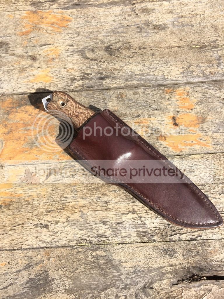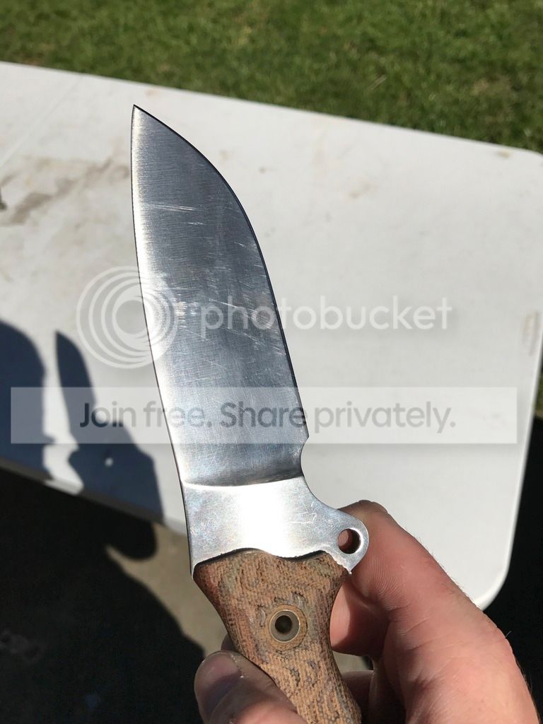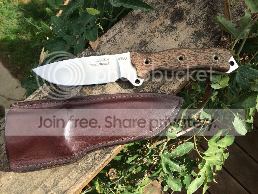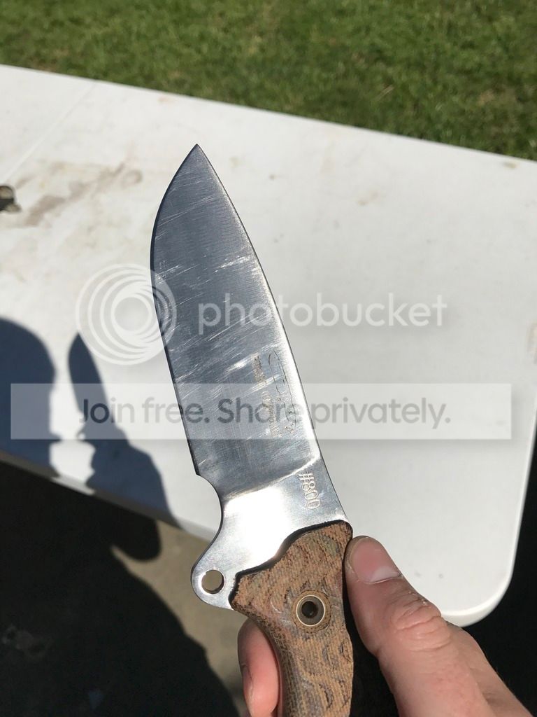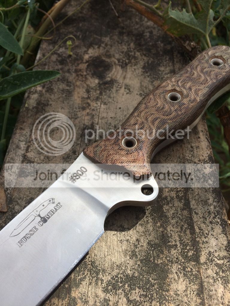 I have a Busse Badger Attack Satin #800 that comes with a lifters leather sheath that I purchased from Arizona custom knives a few years ago. It was used to split a few logs around camp and haven't used it since. It has scratches on the blade so I made sure to try and show as much of it as I could in the pictures provided.