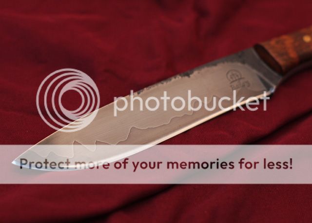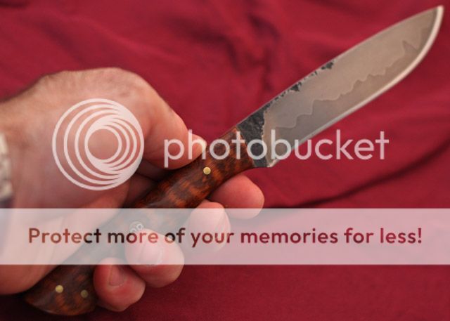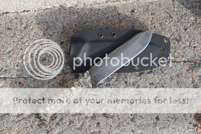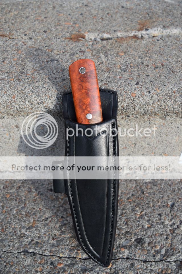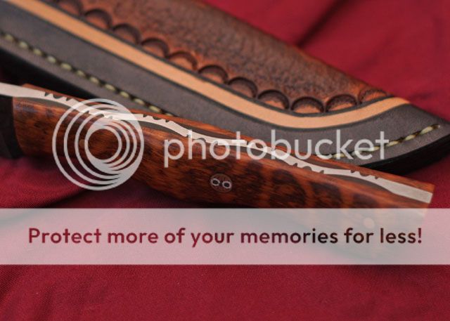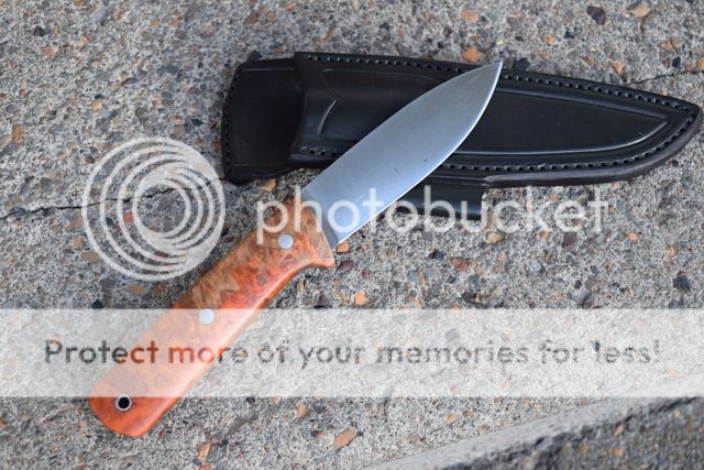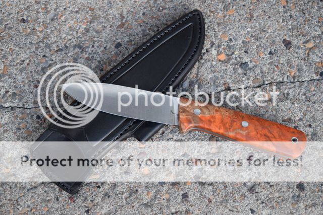 Ray Laconico Kephart Beautiful stabilized burl handle with stainless steel pins, comes with Forest Sheath by Sharpshooter Sheaths. Has some minor patina that could be polished off, as this was used to clean a couple deer. Blade steel: 1095, 1/8" stock. Blade length: 4 1/2" Overall length: 9 1/2" Price - $SOLD