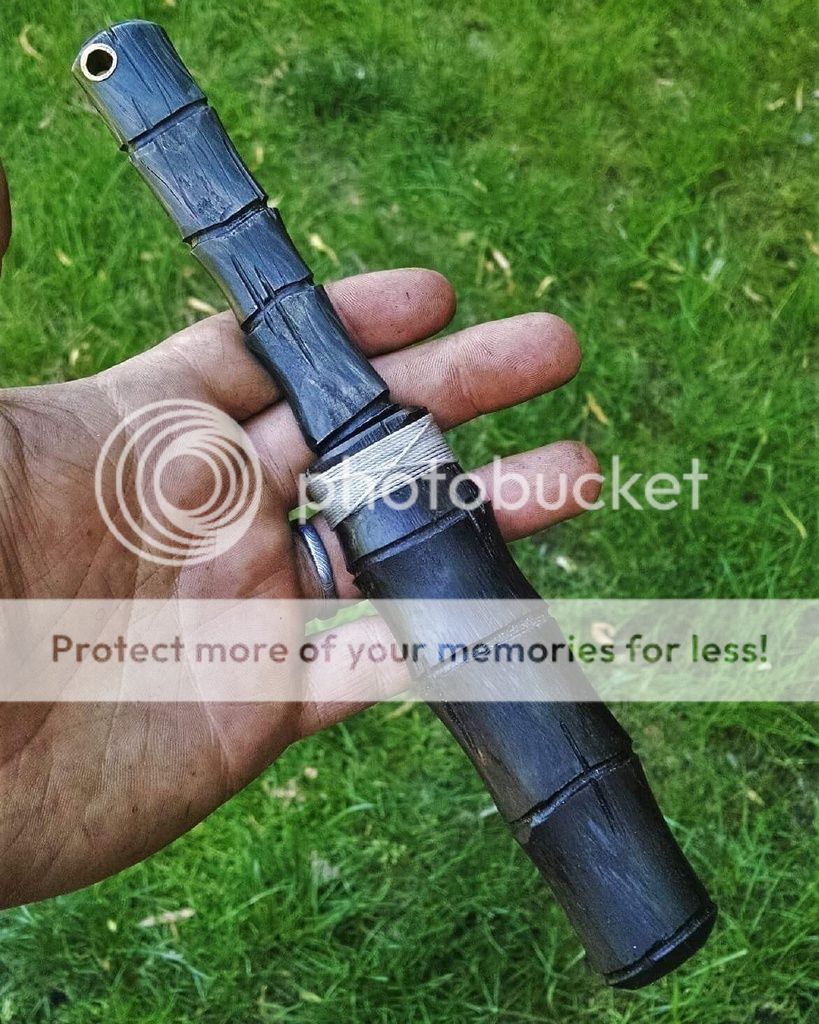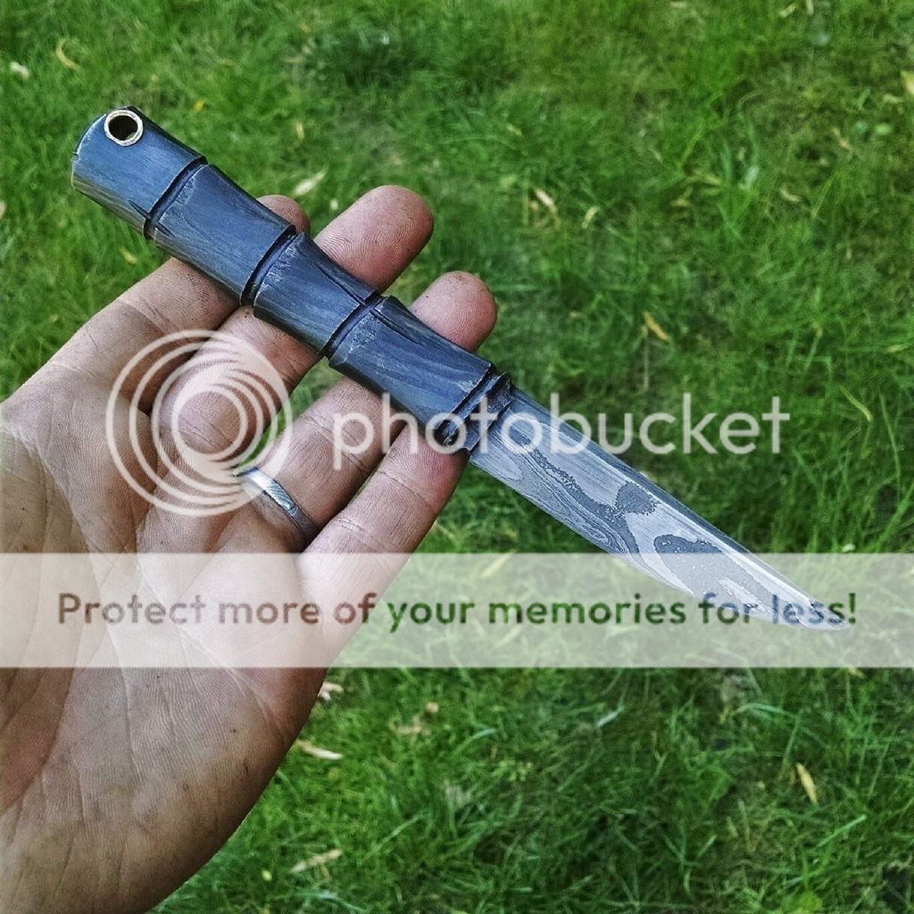 Here is one I just finished up. It is one solid piece of low and high layer twist damascus that has been carved and textured to resemble bamboo with a flared brass lanyard hole. The sheath is carved from diver salvaged oak from Lake Superior that is exceptionally dark, with a white linen cord wrap around the throat of the sheath.