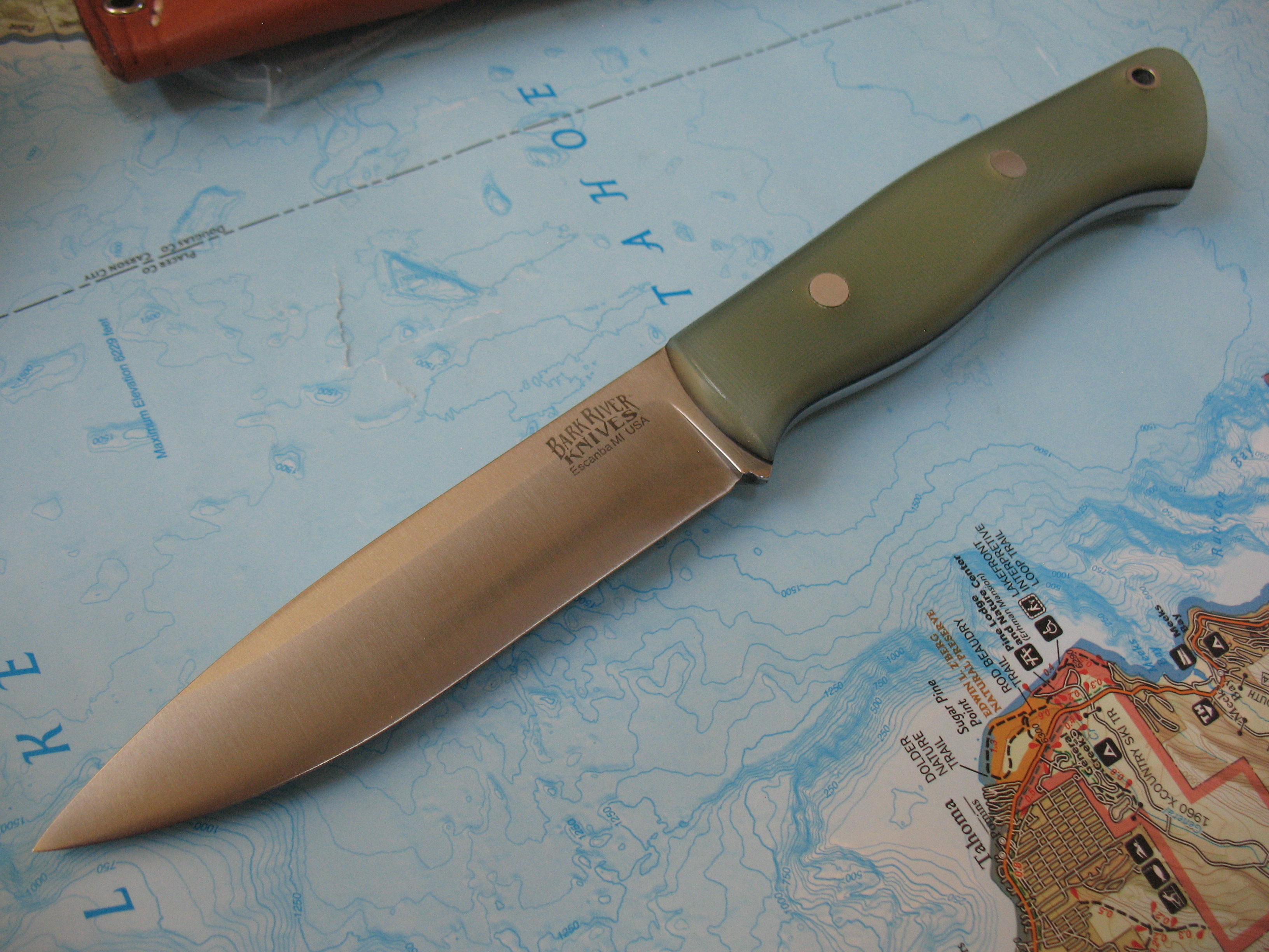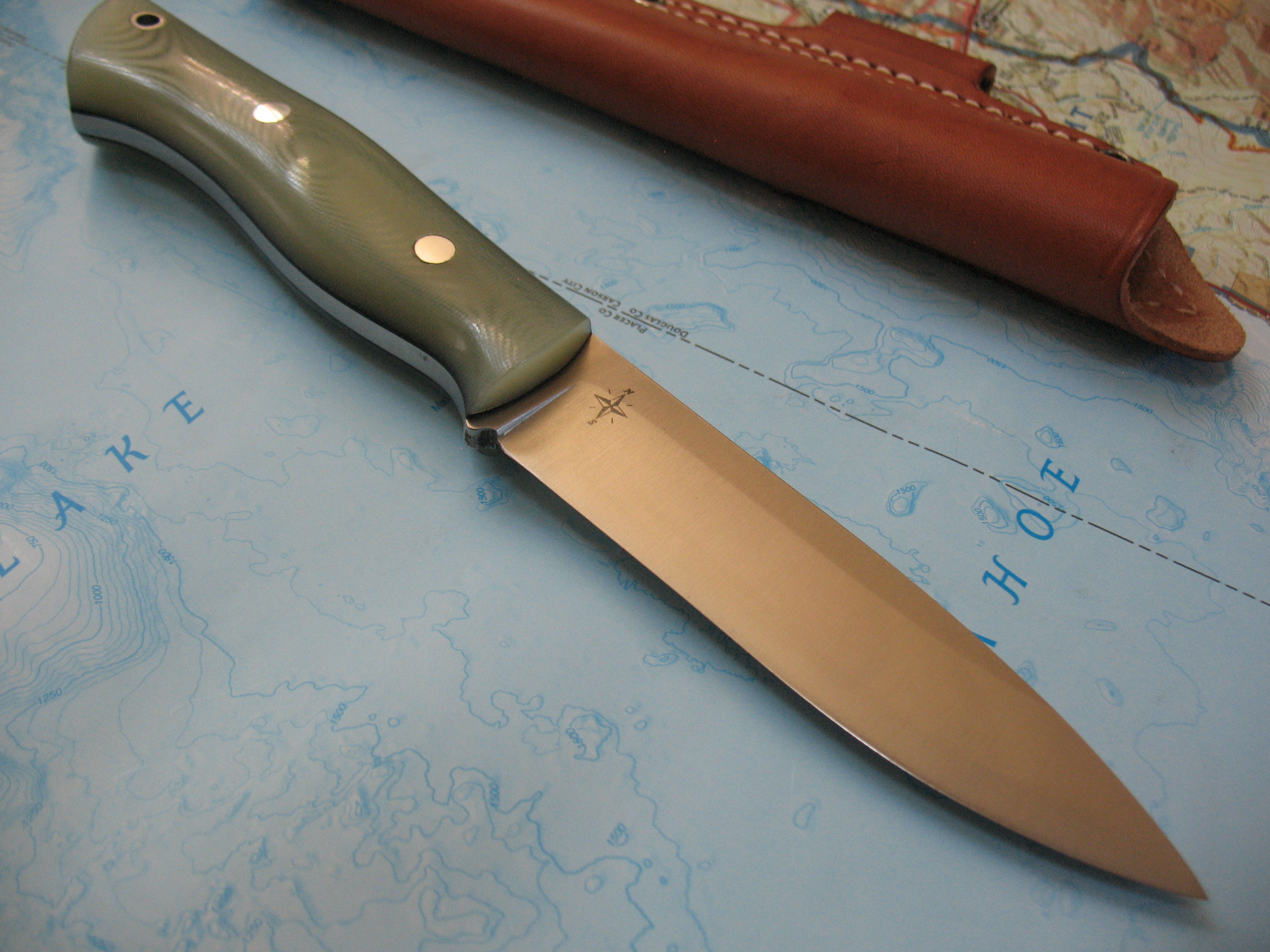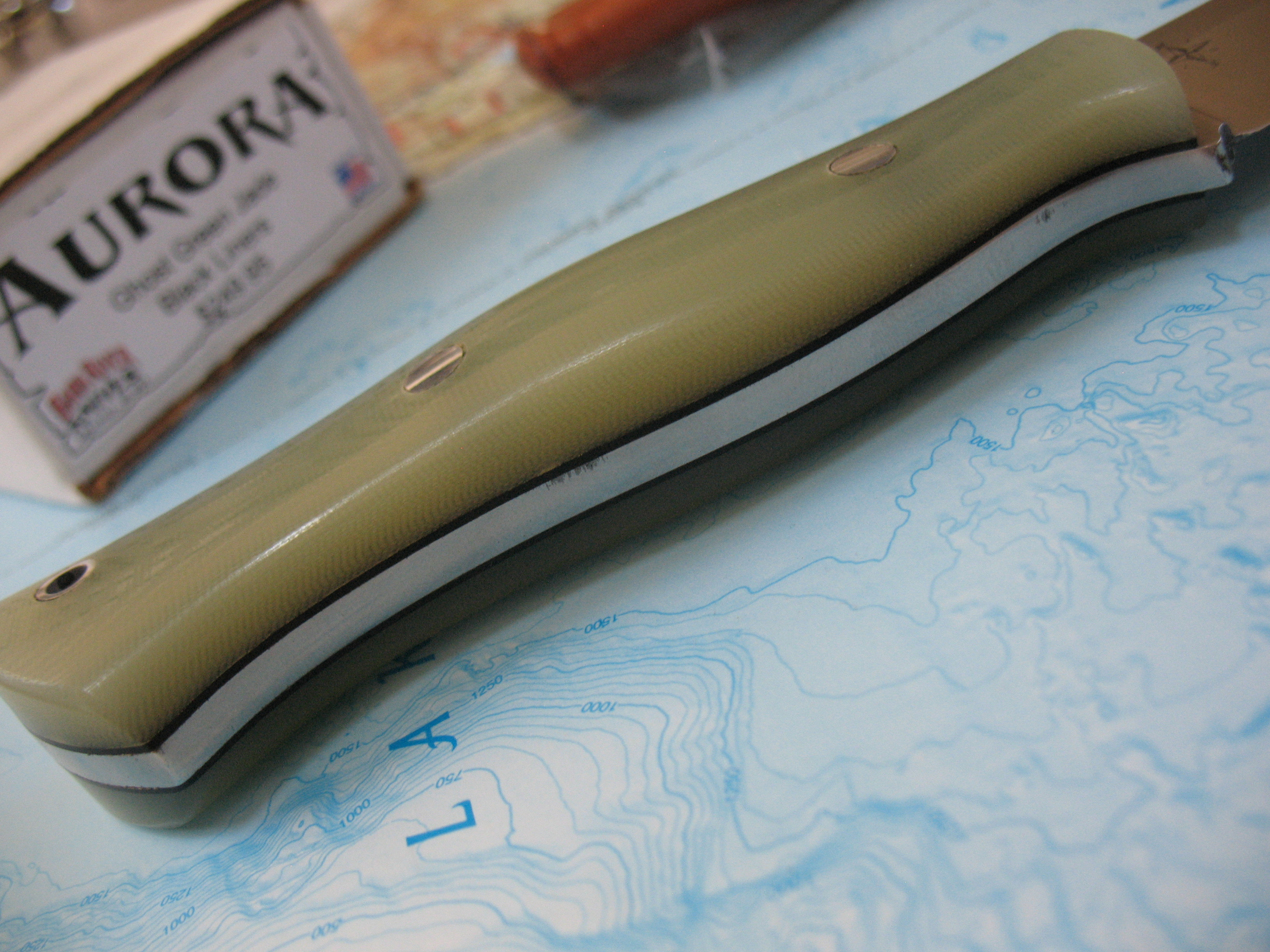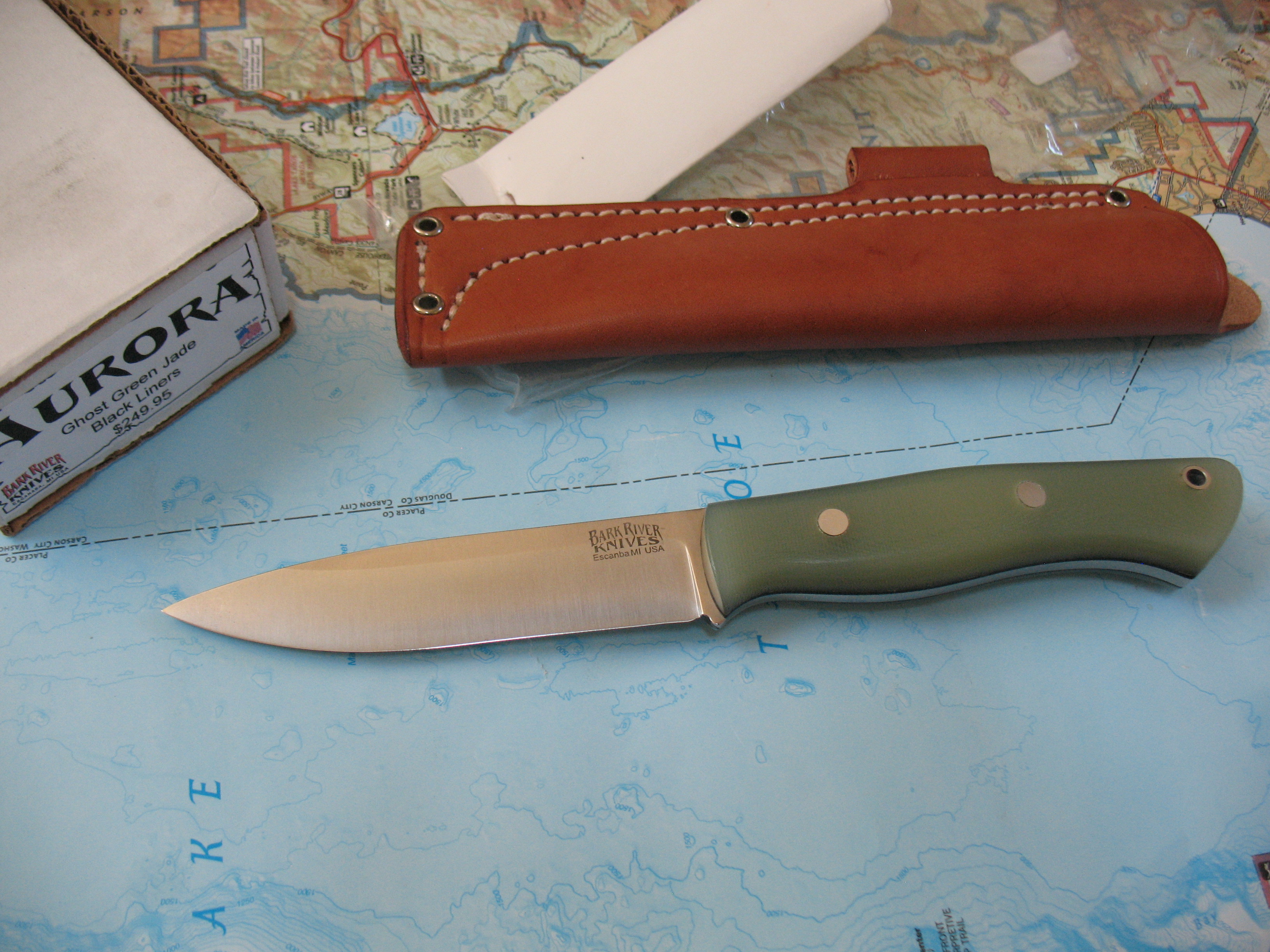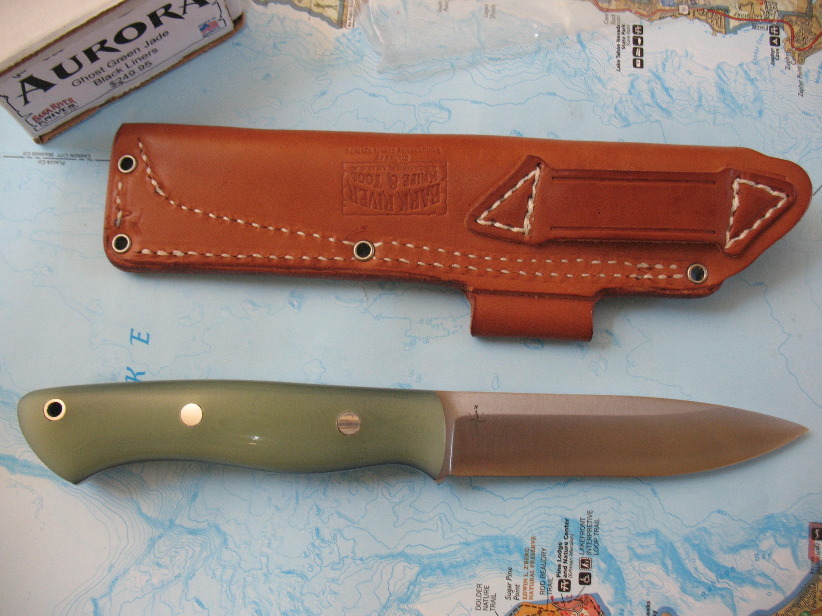 For sale is an unused Aurora that I have had for a while. This is in A2 steel. Ghost green G10 handles with black liners. Sharpshooter Bushcraft leather sheath with fire steel holder. A few patina spots and some light scratches are present.
