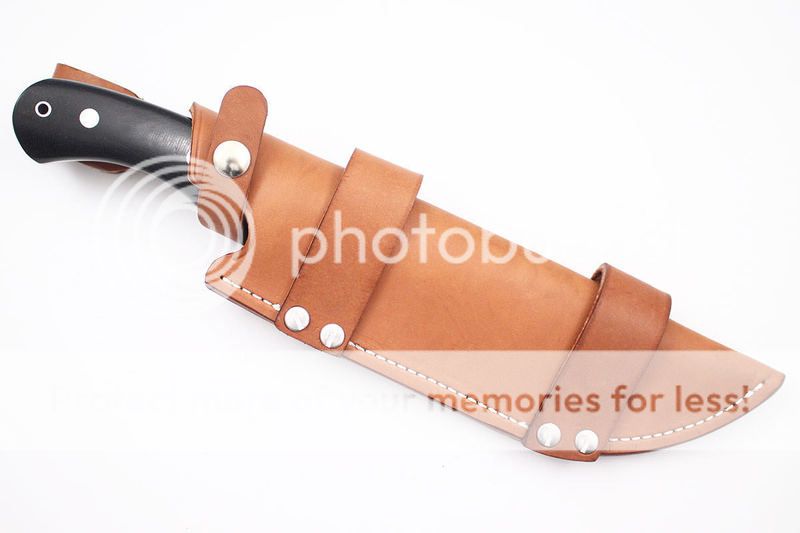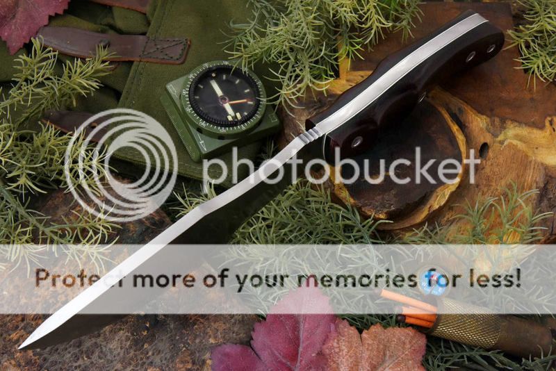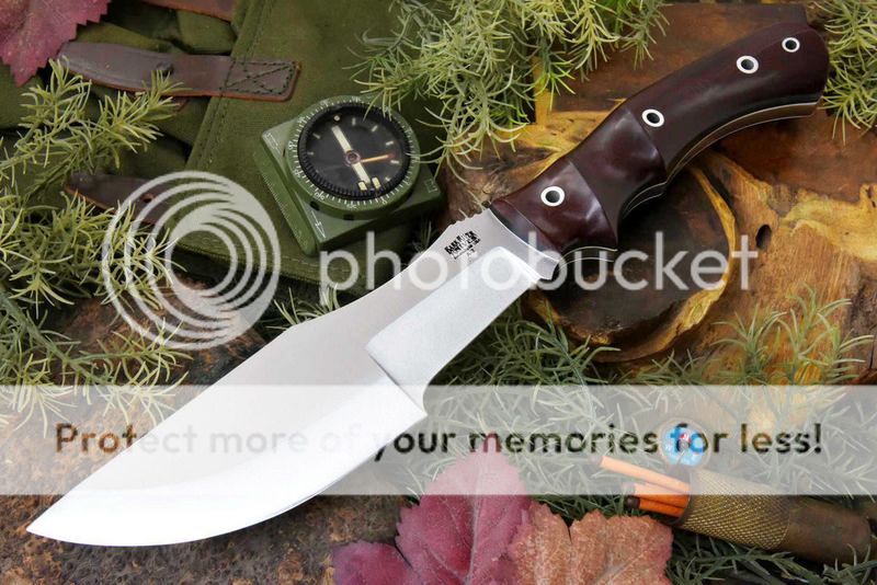 Here is my new Bark River Tracker that I received a couple of weeks ago. Its a BEAST!!! I've carved up a 2x4 with it and thats about it. Only issue it has is that whoever ground it at Bark River got a little hasty with the grinder belt and left a little knick above the drawknife portion. Other than that the grinds are really nice on it and its quite sharp. Maroon Micarta with white and black liners, thick and sharp A2 steel, 7 inch long blade.