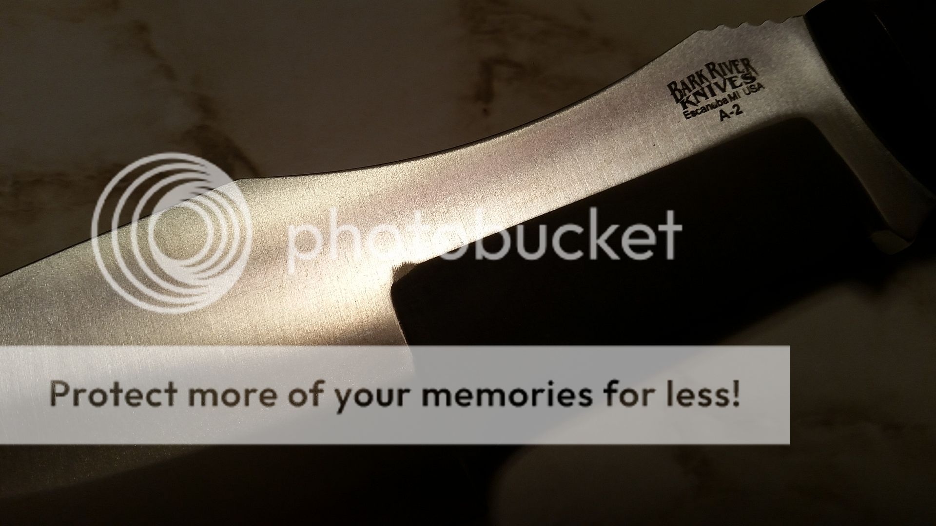 Here is my new Bark River Tracker that I received a couple of weeks ago. Its a BEAST!!! I've carved up a 2x4 with it and thats about it. Only issue it has is that whoever ground it at Bark River got a little hasty with the grinder belt and left a little knick above the drawknife portion. Other than that the grinds are really nice on it and its quite sharp. Maroon Micarta with white and black liners, thick and sharp A2 steel, 7 inch long blade.