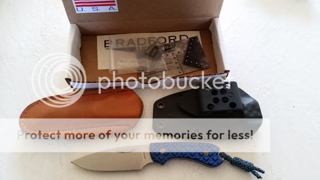 2. Bradford Guardian 3 with black and blue G-10 scales. This is the limited run, M390 Full Flat grind version. Comes with Kydex sheath with G-clip and a right hand cross draw leather sheath. The G-clip can be reversed for right hand carry. Lightly used and carried as well. Knife shows no sign of wear. $130.00 Sold