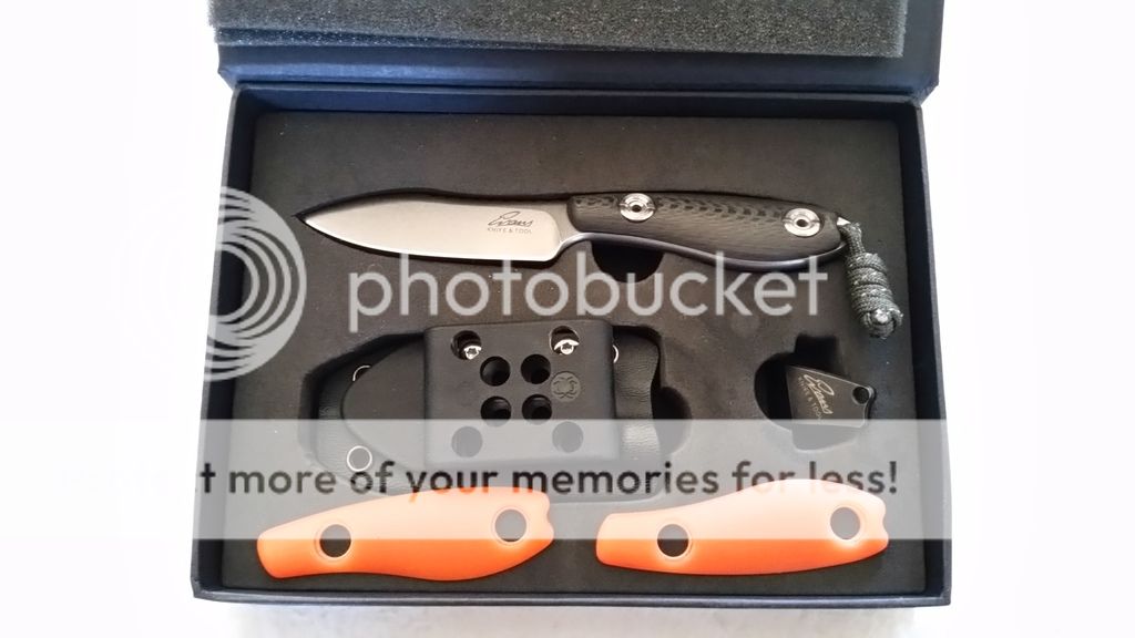 3. Evans Knife and Tool Companion with carbon fiber and orange scales. S35vn, 1st gen. Spyderco G-clip on it as well. Also, lightly used and carried. Also shows no sign of wear. $110.00 [SOLD]