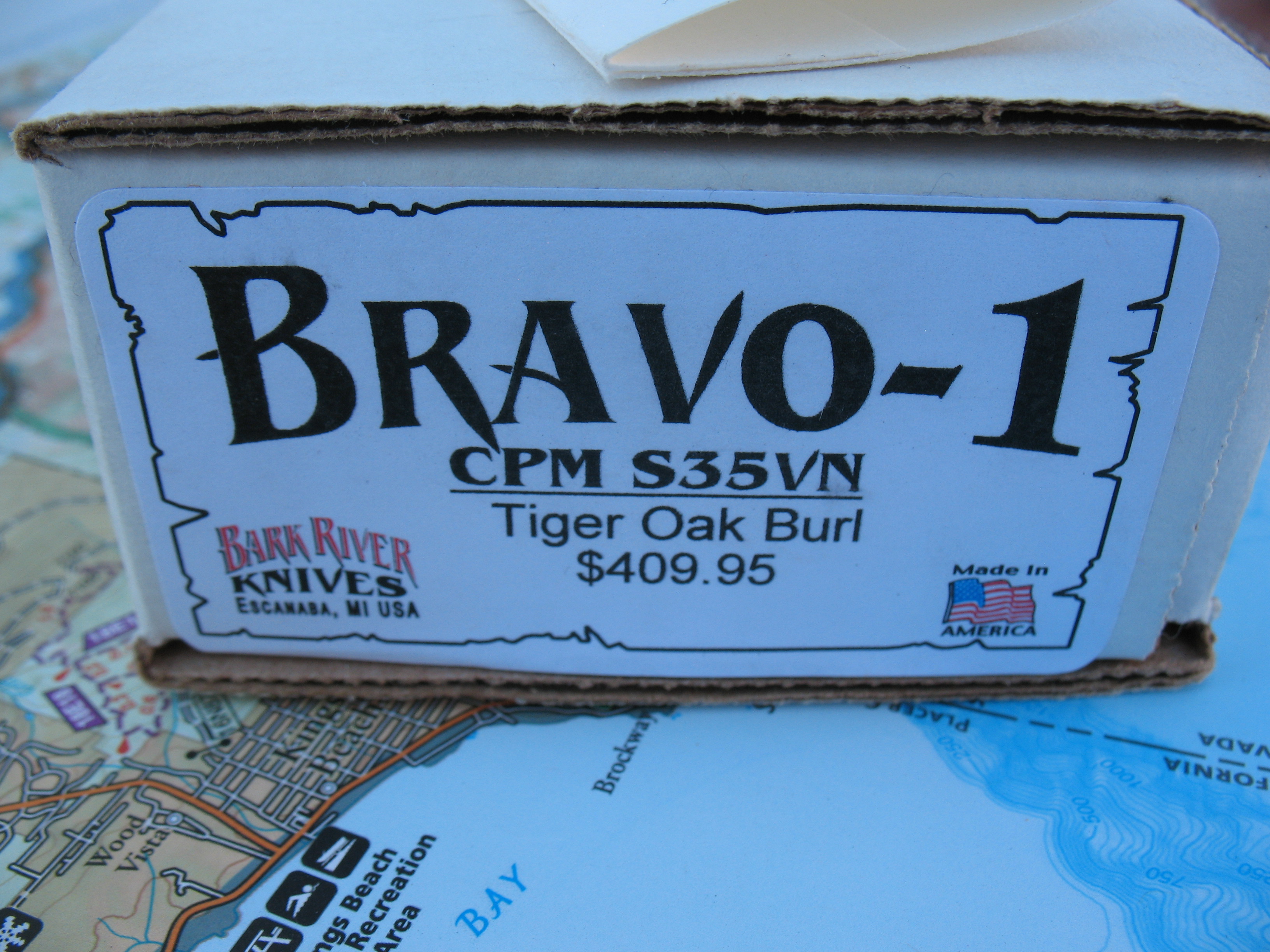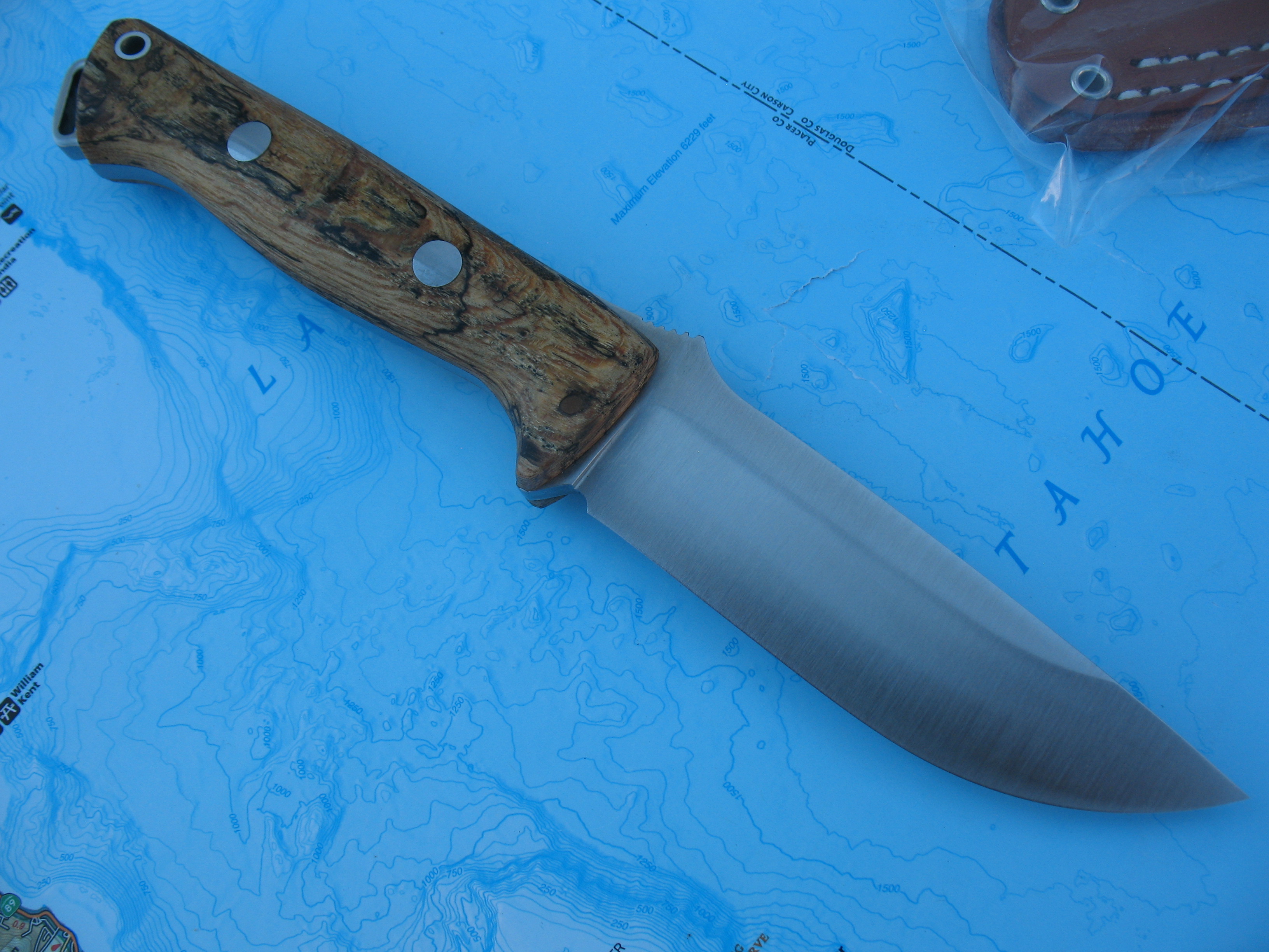 Next is my Bravo 1 in S35VN. This is also unused, uncarried and unsharpened. Beautiful Tiger Oak Burl handles. Leather sheath by Sharpshooter Sheath Systems is in new, unused condition