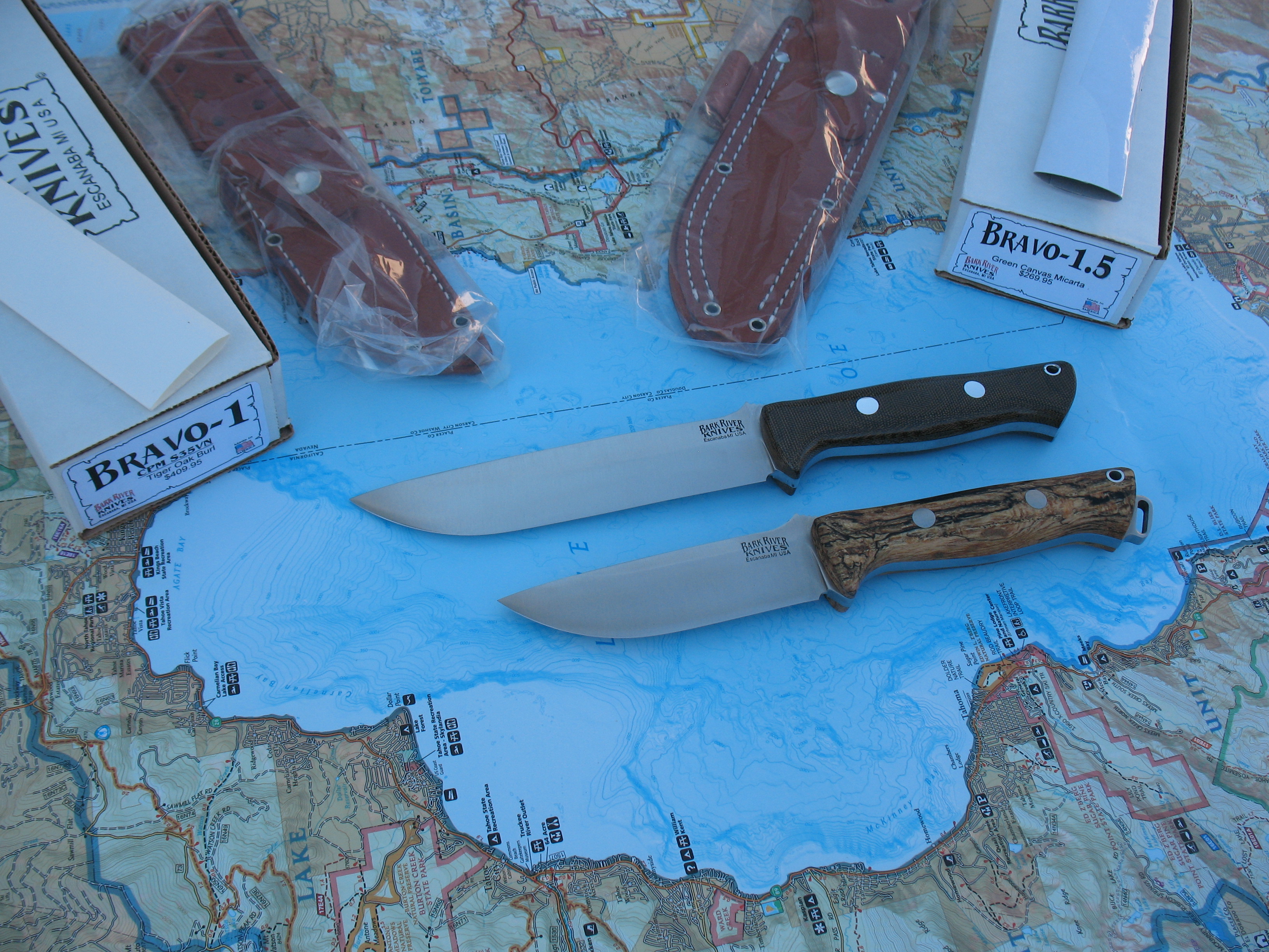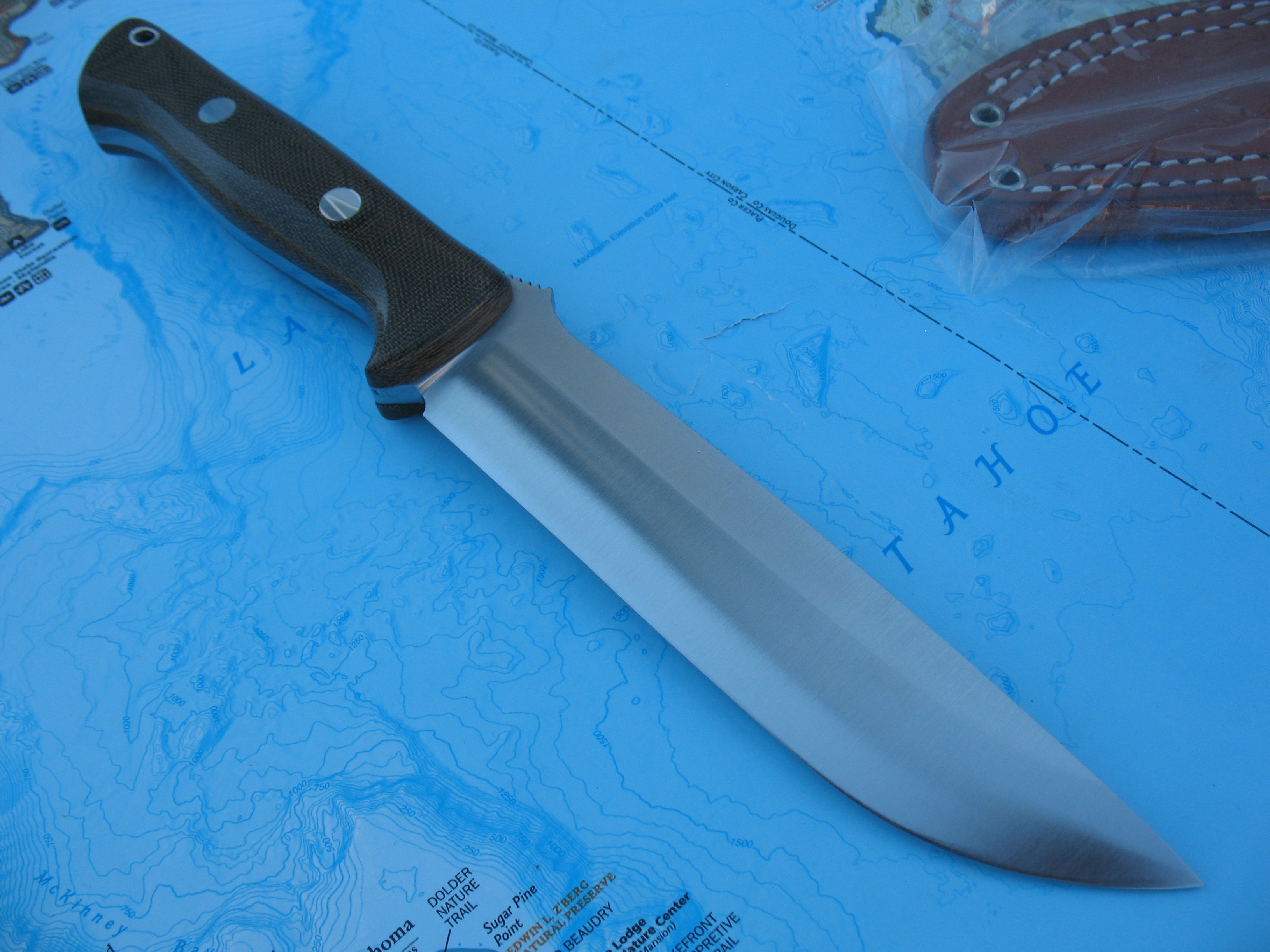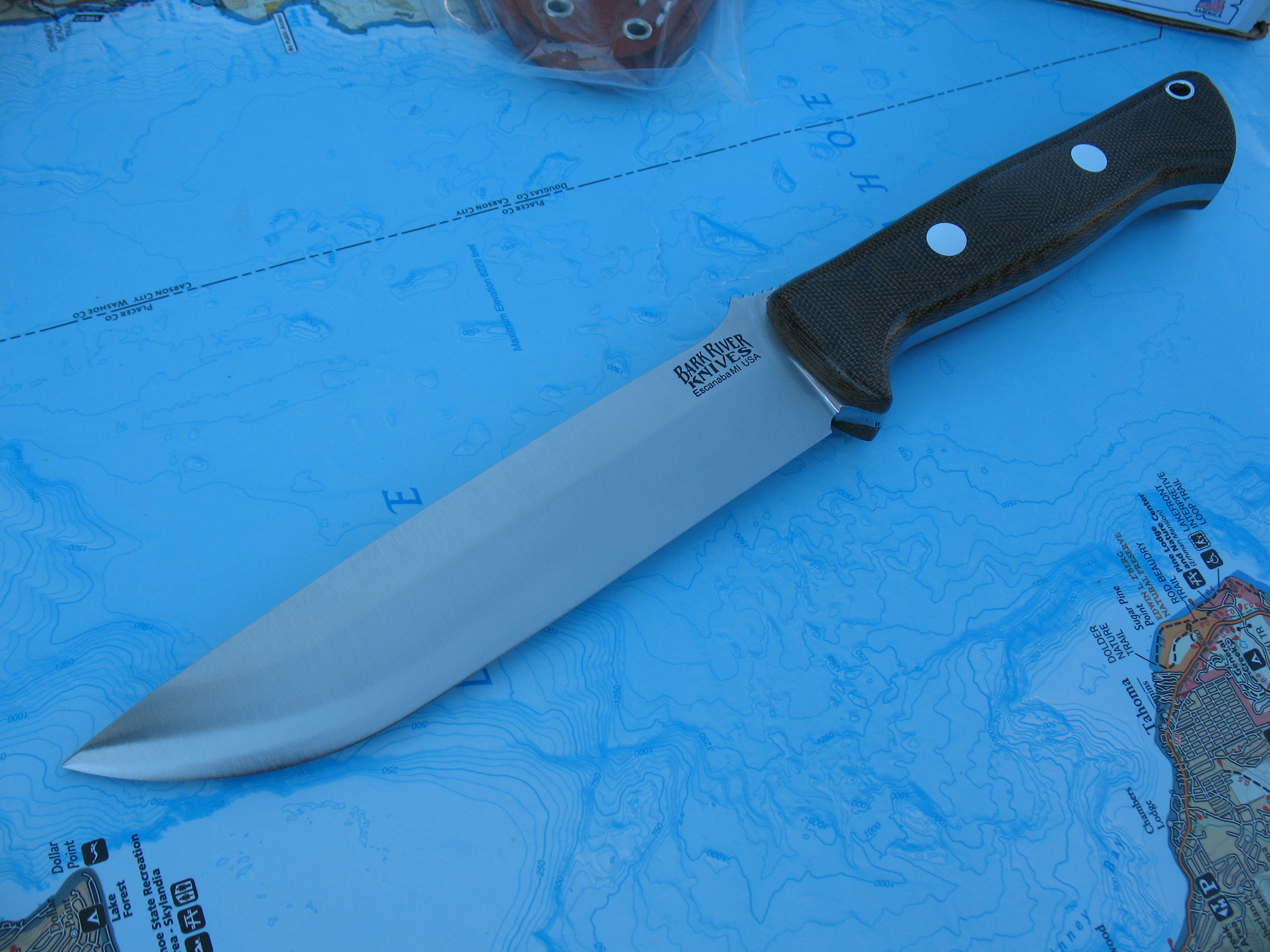 First up is a Bravo 1.5 in A2 steel with green canvas micarta handles. This is unused, unsharpened and uncarried. Some very faint speckling seems to be starting on the non-logo side (hard to see). Sheath by Great Lakes Leather Works is in new, unused condition.