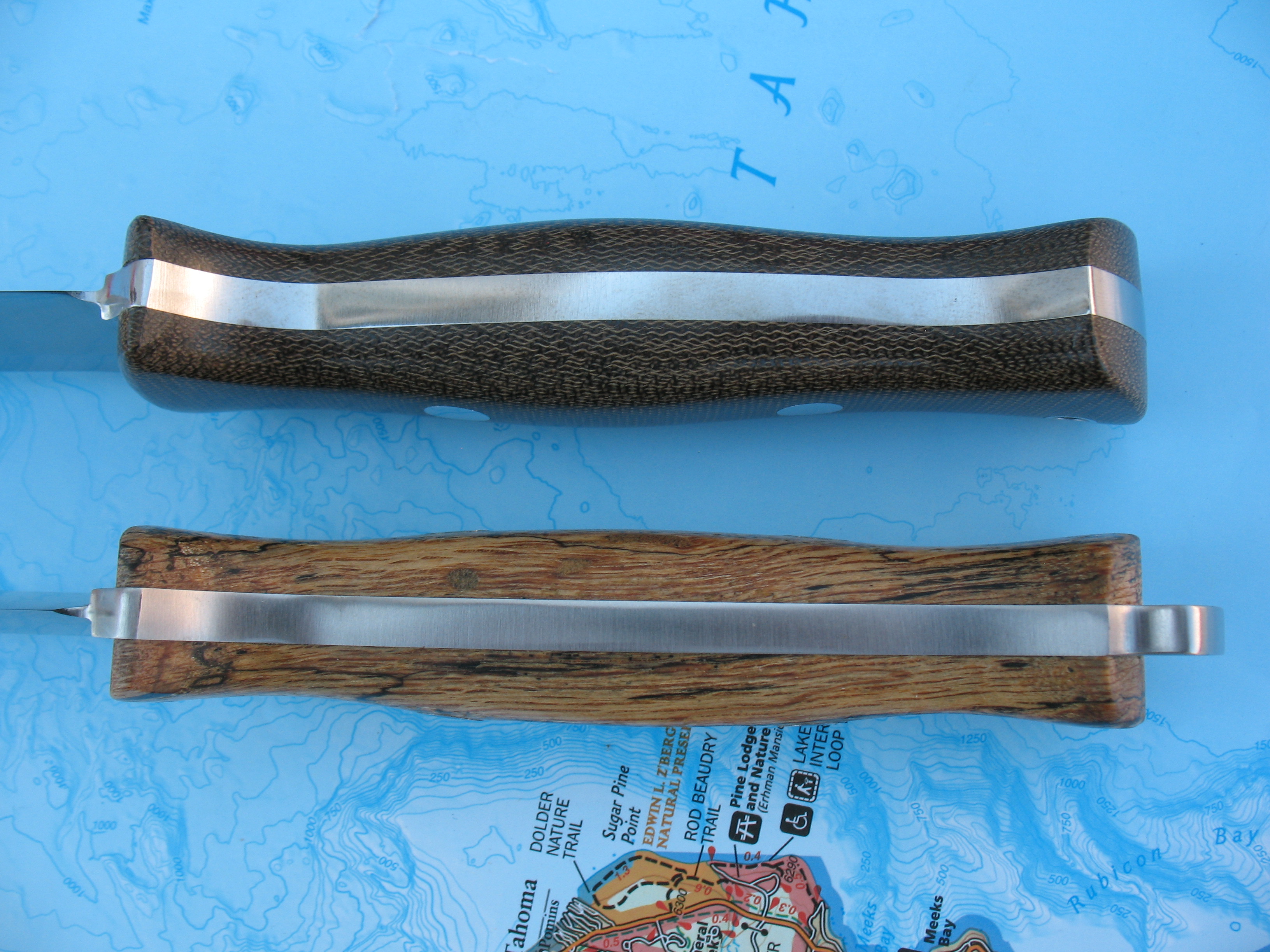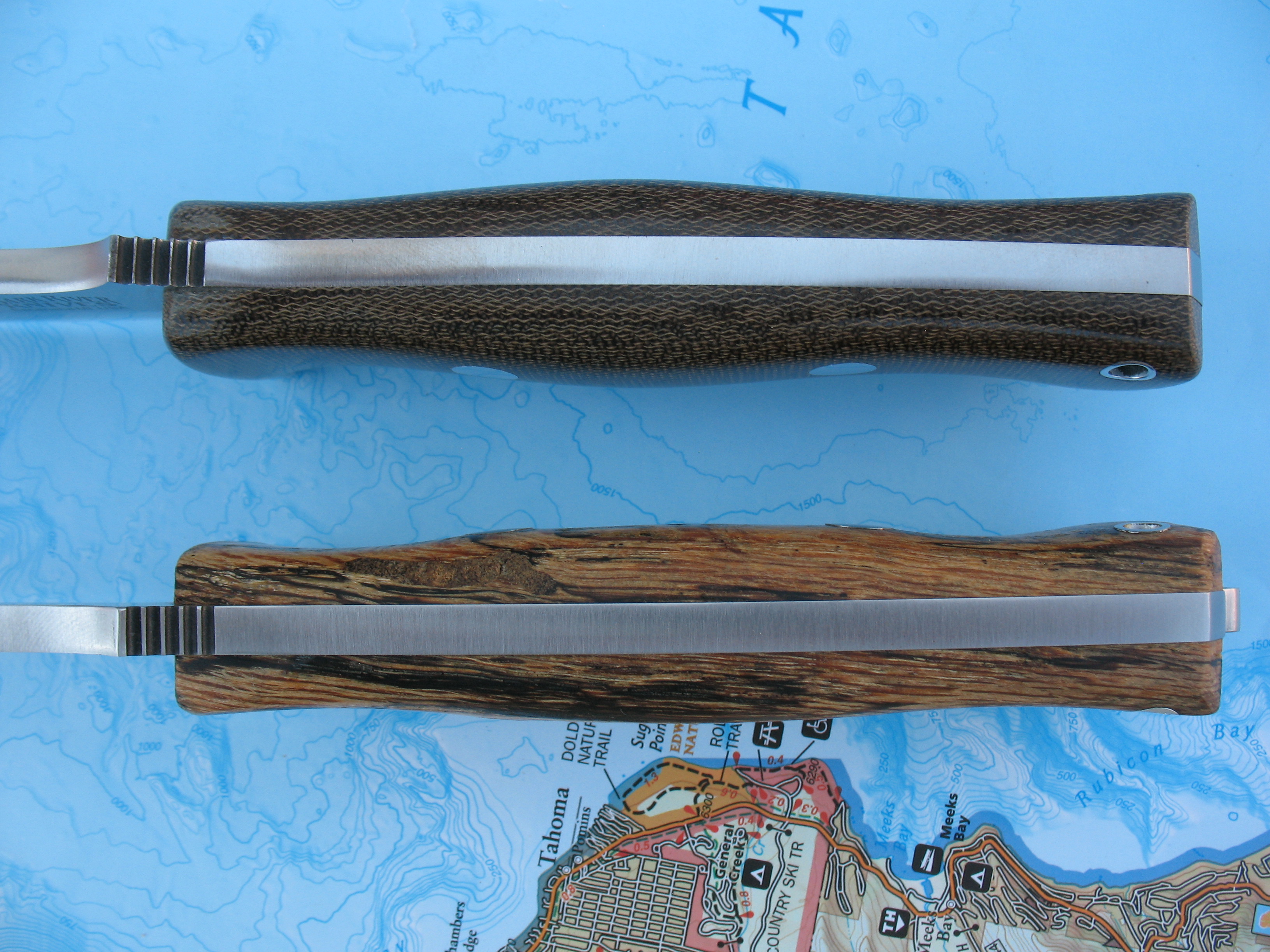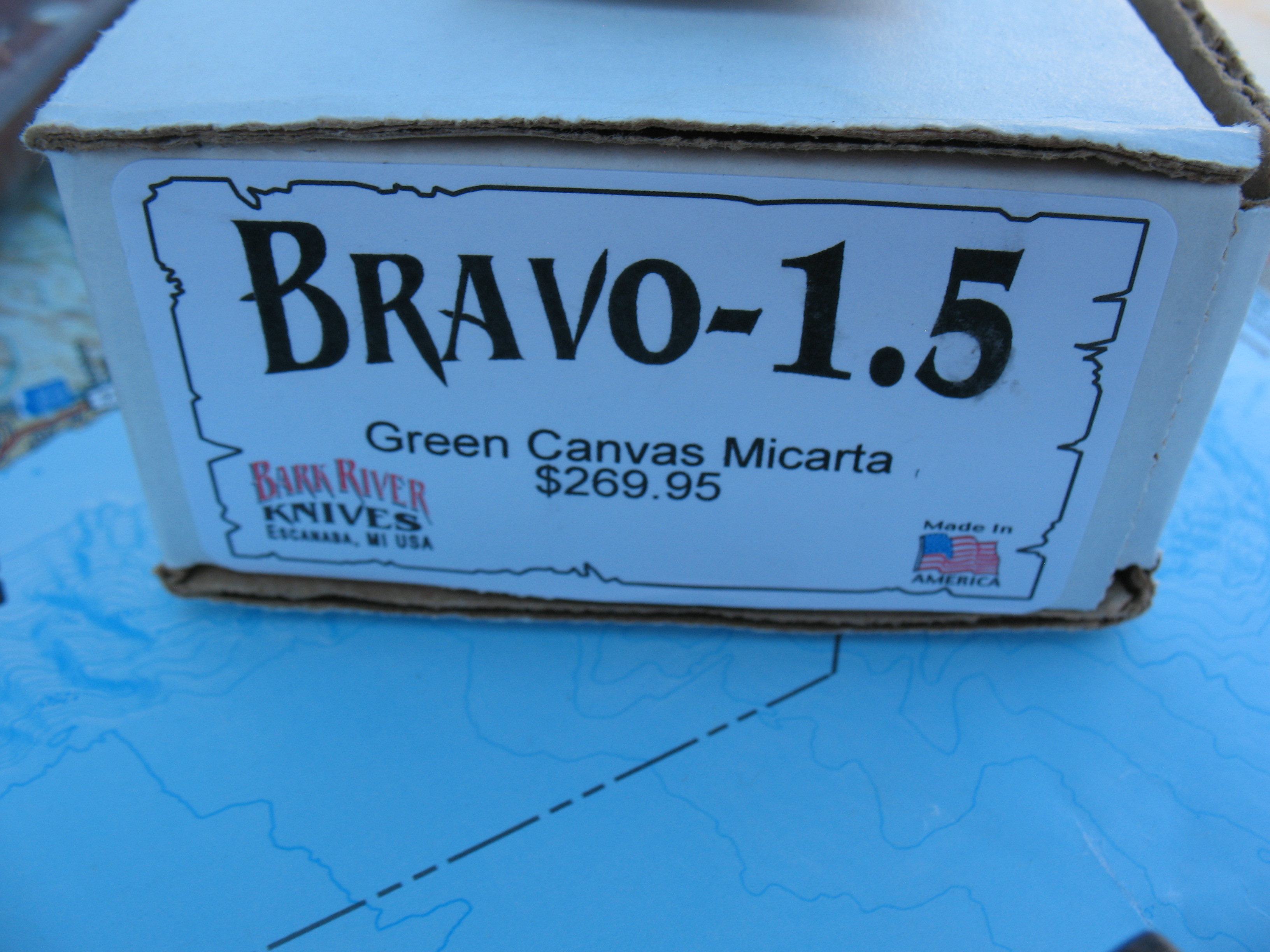 First up is a Bravo 1.5 in A2 steel with green canvas micarta handles. This is unused, unsharpened and uncarried. Some very faint speckling seems to be starting on the non-logo side (hard to see). Sheath by Great Lakes Leather Works is in new, unused condition.