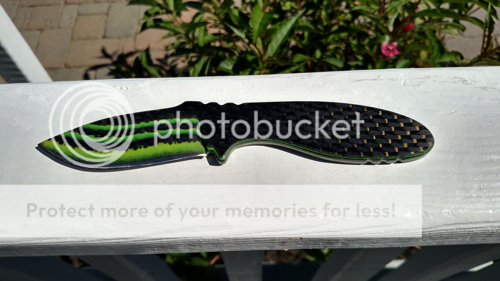 Dan Koster Ultralight EDC. Fibermascus laminated to O1. 1.4 oz, 3"blade , 7" overall. 3/16" thick. 61HRc. Green G10 and carbon fiber by Fibermascus. Very well done kydex sheath.
