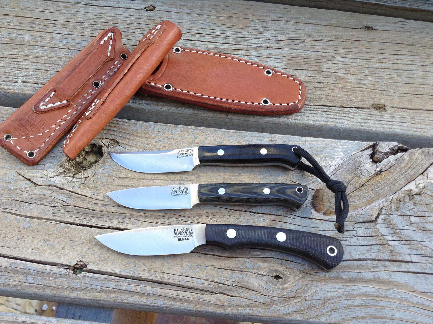 Next is a Bark River Little Caper, in A2 with black canvas and the tan leather sheath., a Bark River Little Creek in A2 with green/black Micarta and leather sheath. Last is a Bark River Pro Scalpel II in Elmax with black canvas and leather sheath.