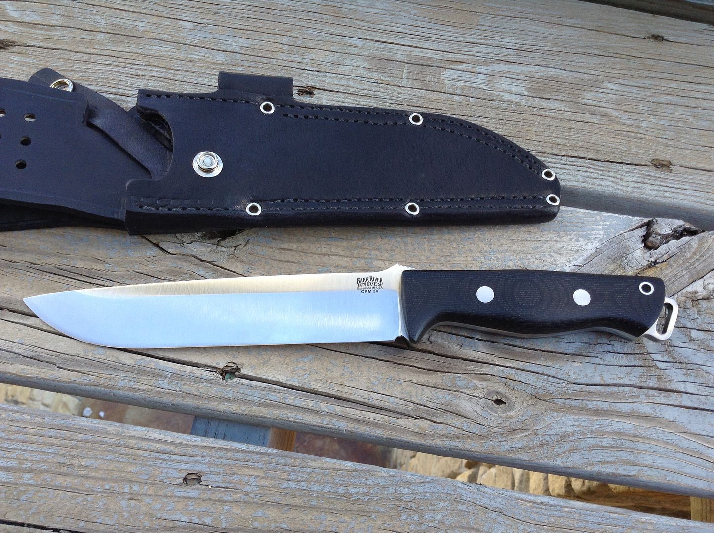 Next is a Bark River Gunny Hunter in CPM3V with black canvas and the factory tan leather sheath which was briefly used with a different knife. I will also include a perfect Kydex sheath from DLT. --SOLD--
