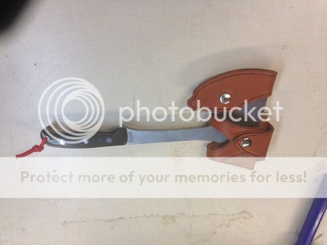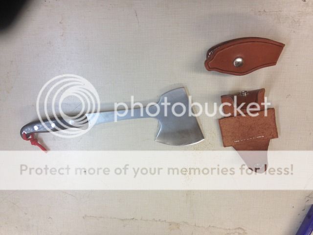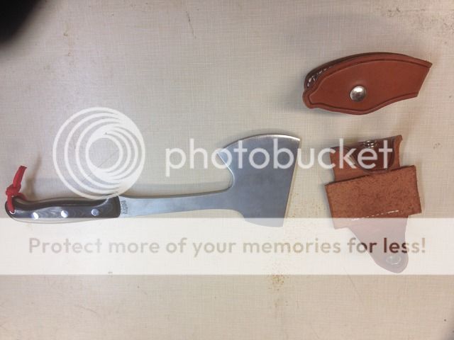 camp axe, used and sharpened. Patina and spotting, sheath shows storage wear. Includes belt hanger.