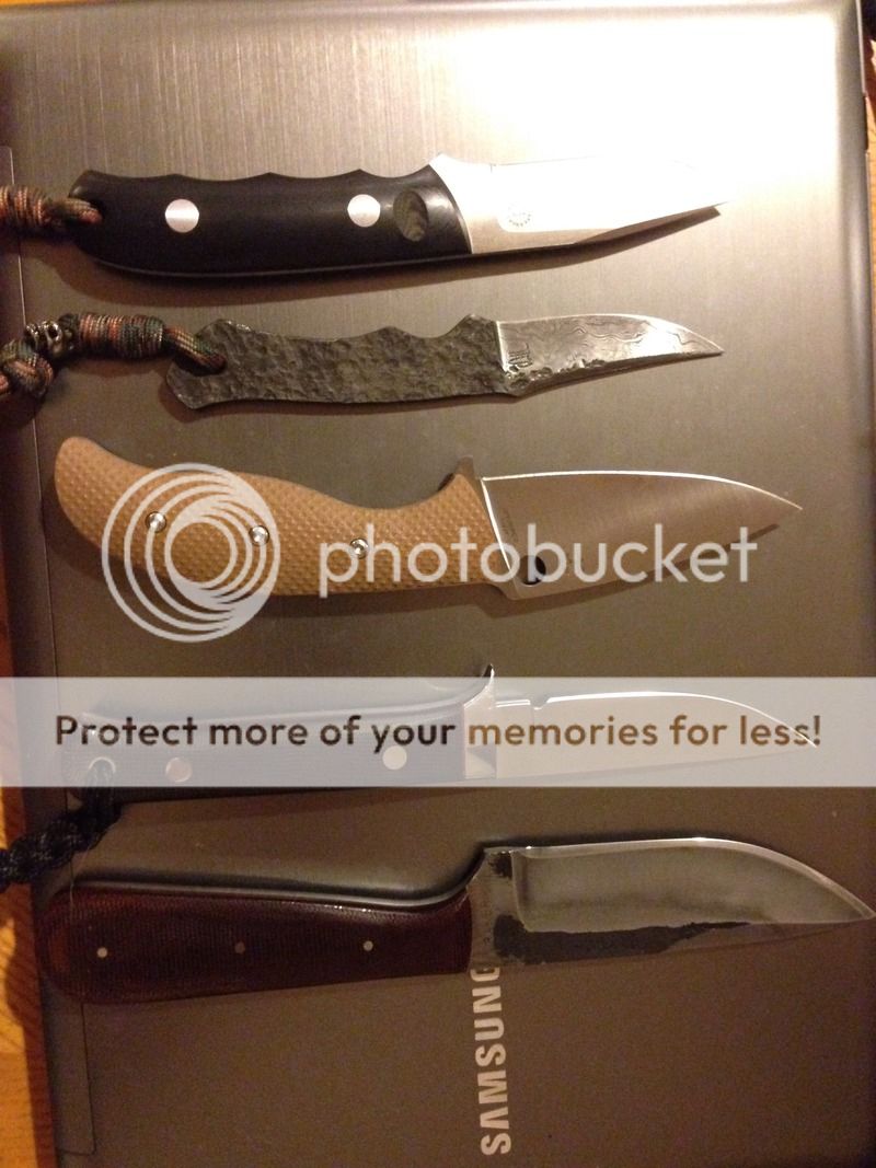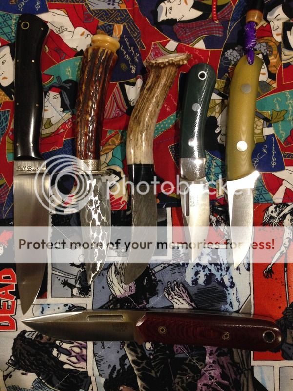 Buxton 1080/ebony bushcraft (scale shrink, minor), Graves bowie, GL Drew Cable damascus patch, BRKT M4 Essential(patina'd), Dozier Lil Deer(light scratches on blade flats), BRKT Springbok (light scratches near tip, cut gritty cardboard) $135 shippedGONE
