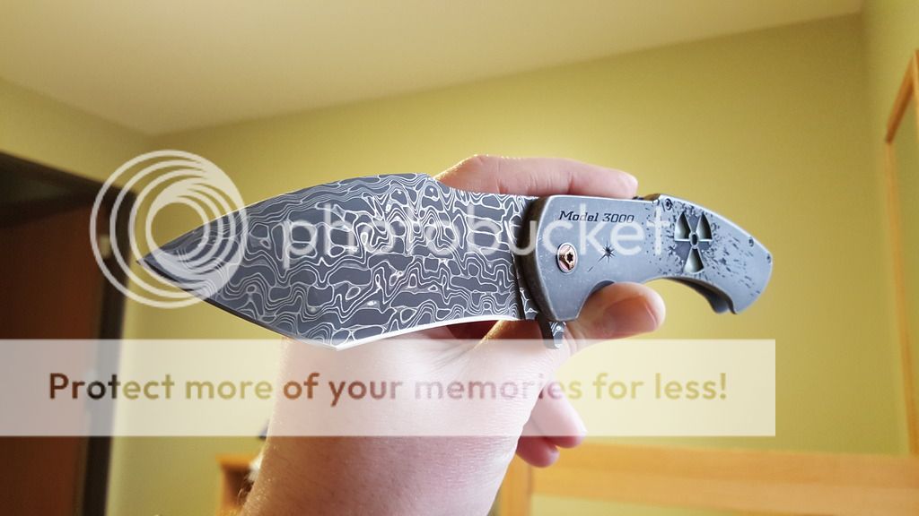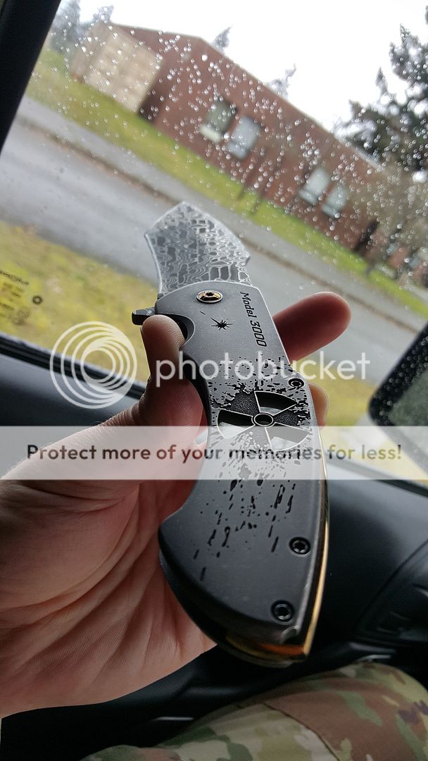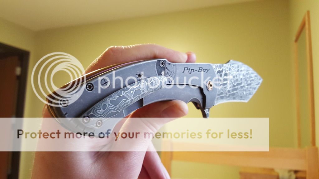 BARRETT FALLOUT 1 of 1: This is the only version of this knife and it is in pristine shape. I would honestly give it a 99%. Centered with no play, strong lockup and ridiculously smooth action. I got this a few months ago but hardly ever carry it. Won't be sad if it doesn't sell because it is an amazing knife. Damascus blade, etched titanium handles and the "moonglow" radioactive symbol inlayed in the handle. No flaws that I can see. Asking $2,900 $3,000 obo.