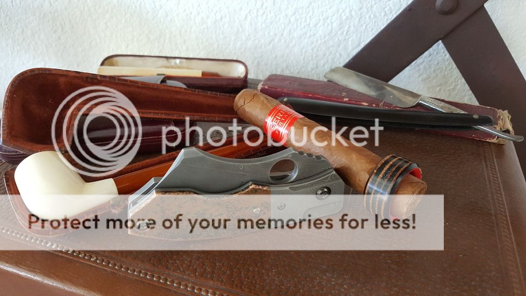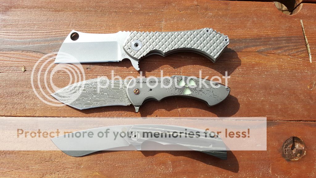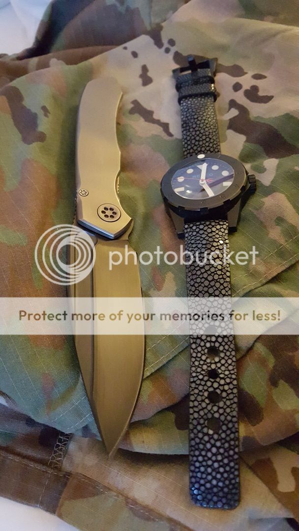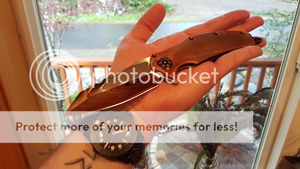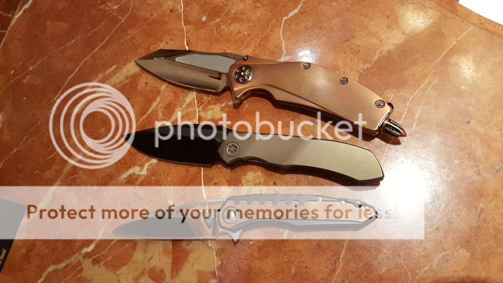 Marfione Custom Anax: This model features the DLC blade and bronze titanium frame. Comes with the original case, certificate, "devil's tail" attachment, etc. No flaws in the blade or handle but does favour one side but does not scrape. I do not have a tool for this pivot to adjust it. I have not noticed an other issues whatsoever. DLC shows fingerprints and oild pretty easy though, lol. Asking $1,050 $1,100 (first owner fall 2015) - Case and all