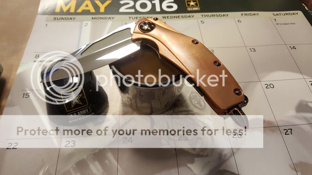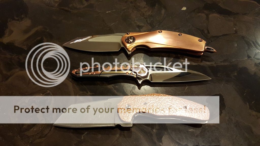 Marfione Copper Matrix #017: Another beautiful knife that is fairly large and has some good weight to it due to the copper. This one is also centered without play, buttery action and strong lockup. Mirror polish Elmax blade with full tritium copper handle, copper "skull crusher" and a DLC/copper backspacer. Very, very small scratches on the blade that are hard to see. Mirror polish just shows easier but no actual damage to the knife. No other flaws that I can see. Asking $1,950 $2,000 obo. (first owner since fall 2015) - Case and all