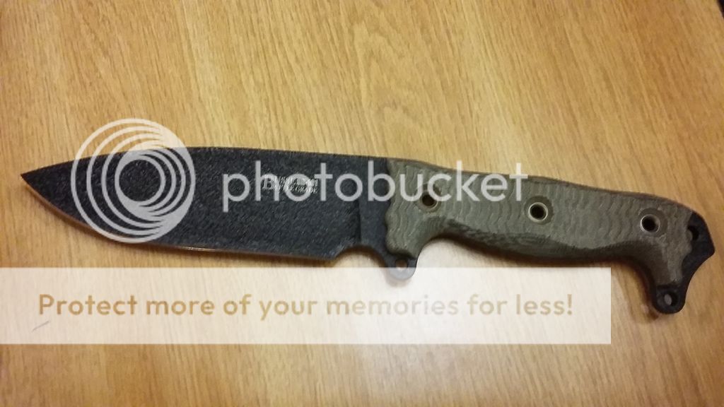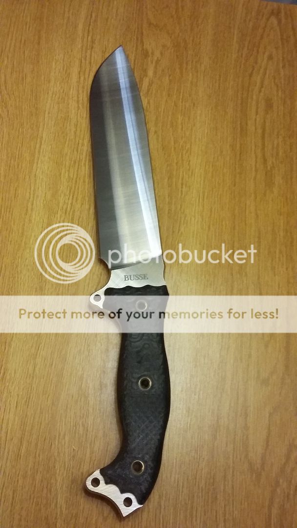 2.) Busse nmfsh b.i.g finish black g10 handles new never used but has some light scratches from inserting in netting and cardboard sheath. Has also a small cluster of patina or might be light rust on one side of blade.535.00$
