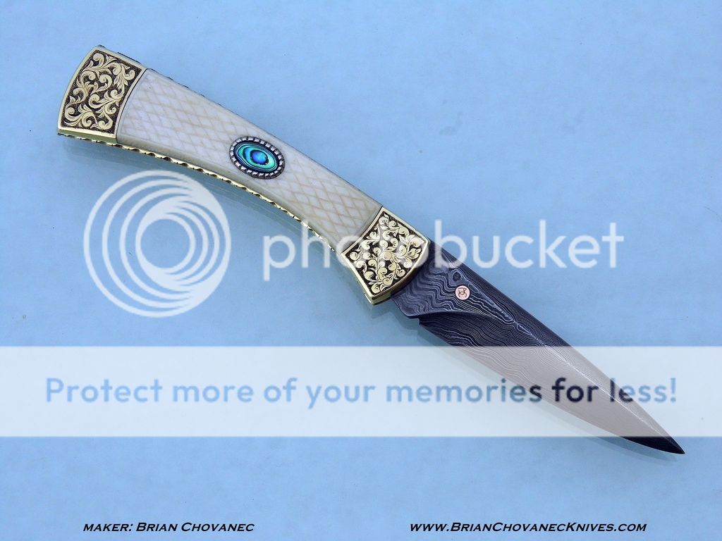 ... bronze/brass liners and bolsters, damascus insides, hand carved weaved basket bone slabs (hidden pins) ,inlays: sterling silver,Paua abalone,rose gold...also features hand engraved sterling silver toothpick ....walks and talks sweet,will come in a case with a COA...and of course,as with all my knives,it is 100% handmade and one of a kind...I absolutely HATE pricing my work,especially something like this as it is very first of its kind for me (there might or might not be others at some stage, but there's only one "the first"