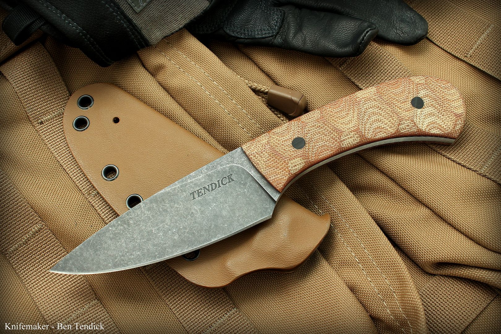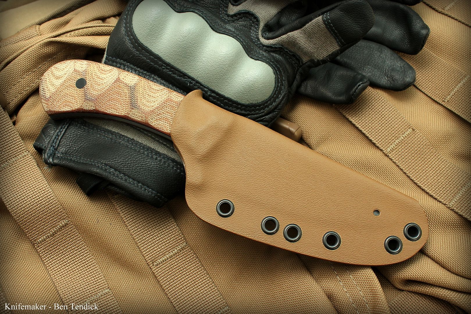 My "Honeycomb" textured handles are designed to offer excellent grip without sacrificing comfort. The "birds beak" style handle is very secure and is the most comfortable design I have used in an ice-pick style grip. The handle is is also a bit wider and thinner for a very low profile on your belt or gear. The blade profile is very useful for just about any task.