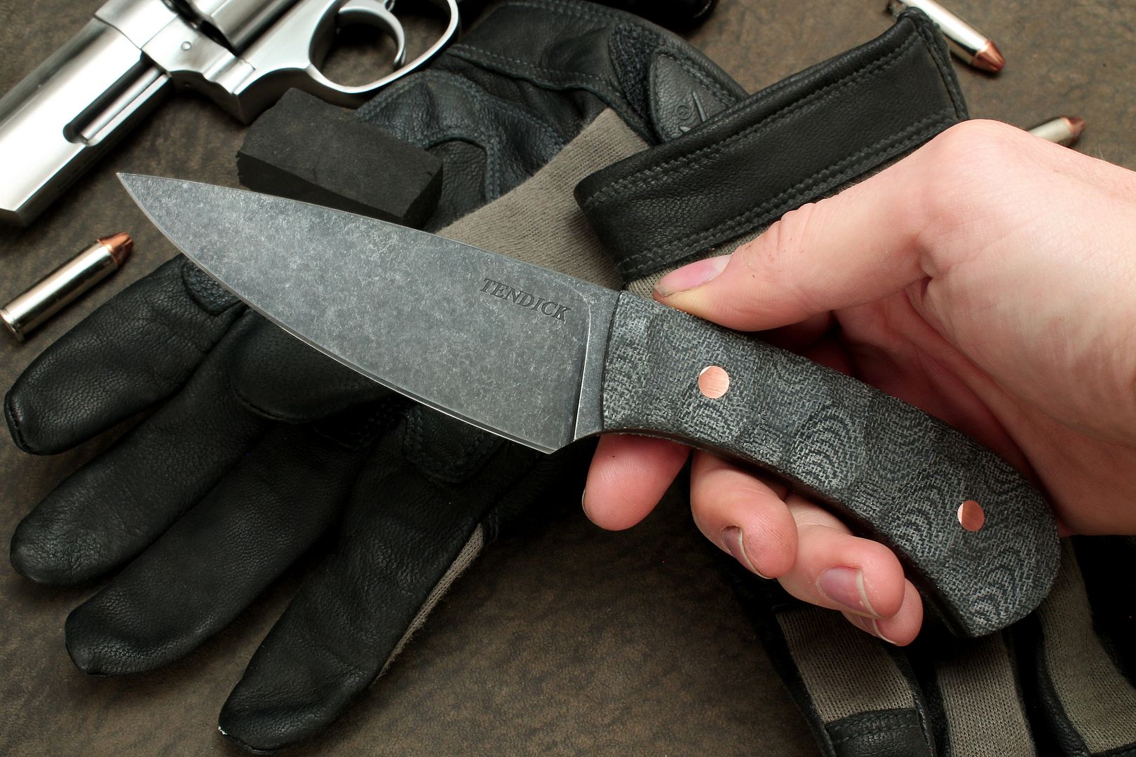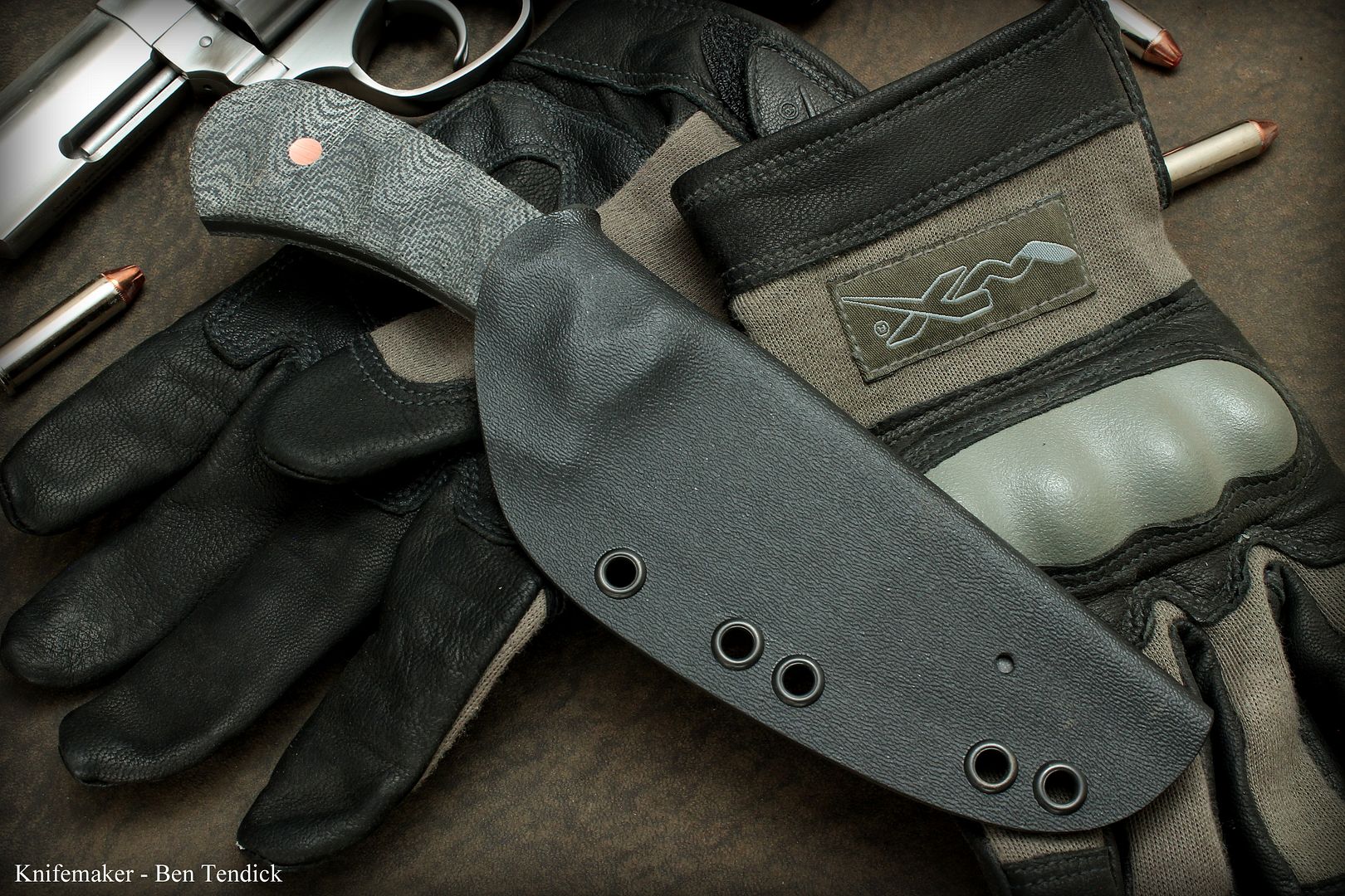 My "Honeycomb" textured handles are designed to offer excellent grip without sacrificing comfort. The "birds beak" style handle is very secure and is the most comfortable design I have used in an ice-pick style grip. The handle is is also a bit wider and thinner for a very low profile on your belt or gear. The blade profile is very useful for just about any task.