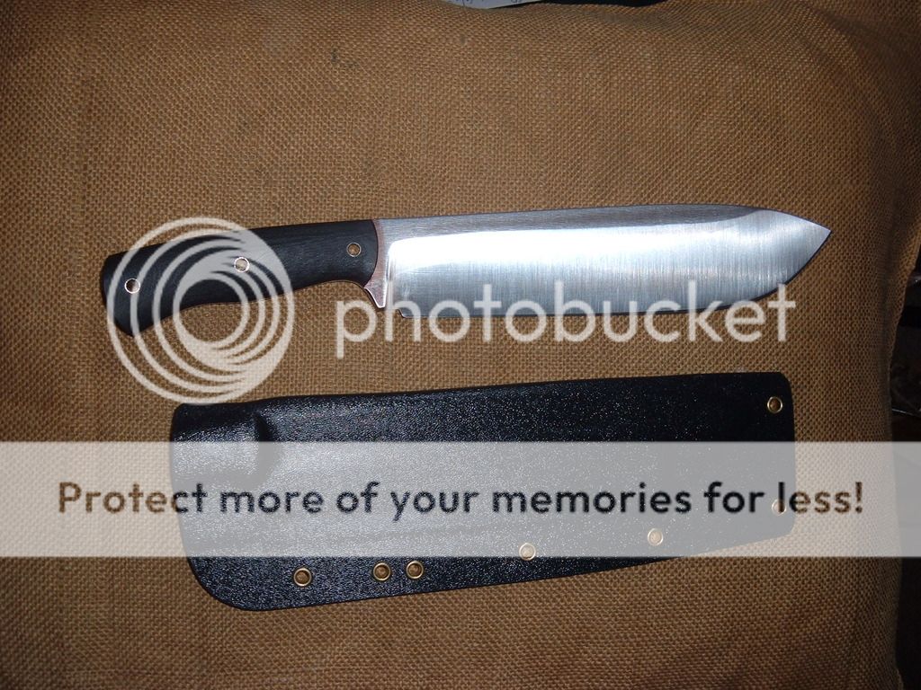 Rough textured black G10 scales over 1/4in thick 5160 blade. 15in overall with a 9 3/4in blade tip to handle. Blade is 2 1/4in at it's widest. The Bolo weighs in at 22oz. Sheath is black Kydex and set up for a large size Tek Lok(not included). Price for this one of a kind is $250 ***sold***shipped in the US(Paypal or USPS MO).