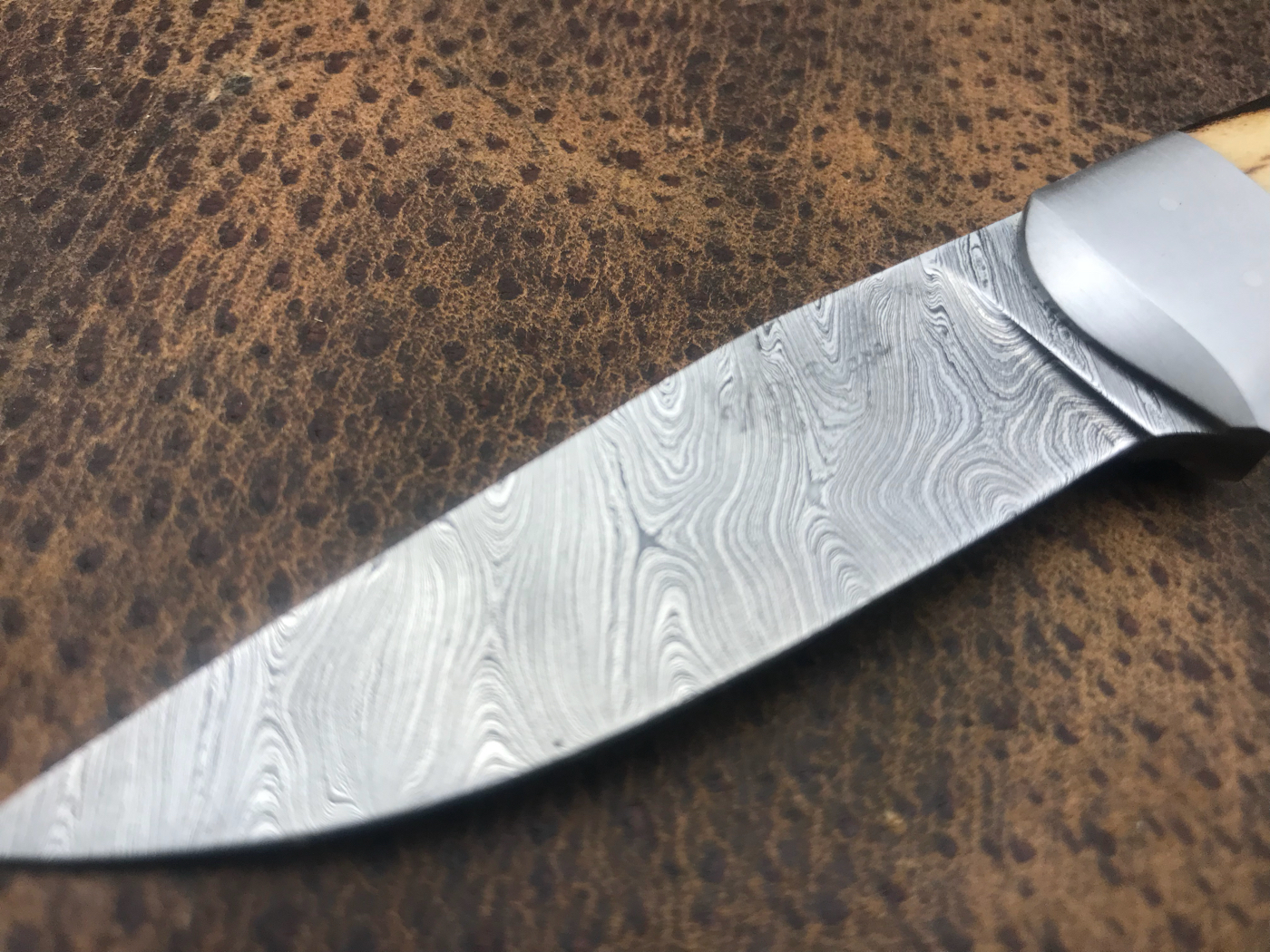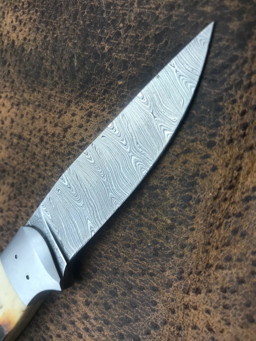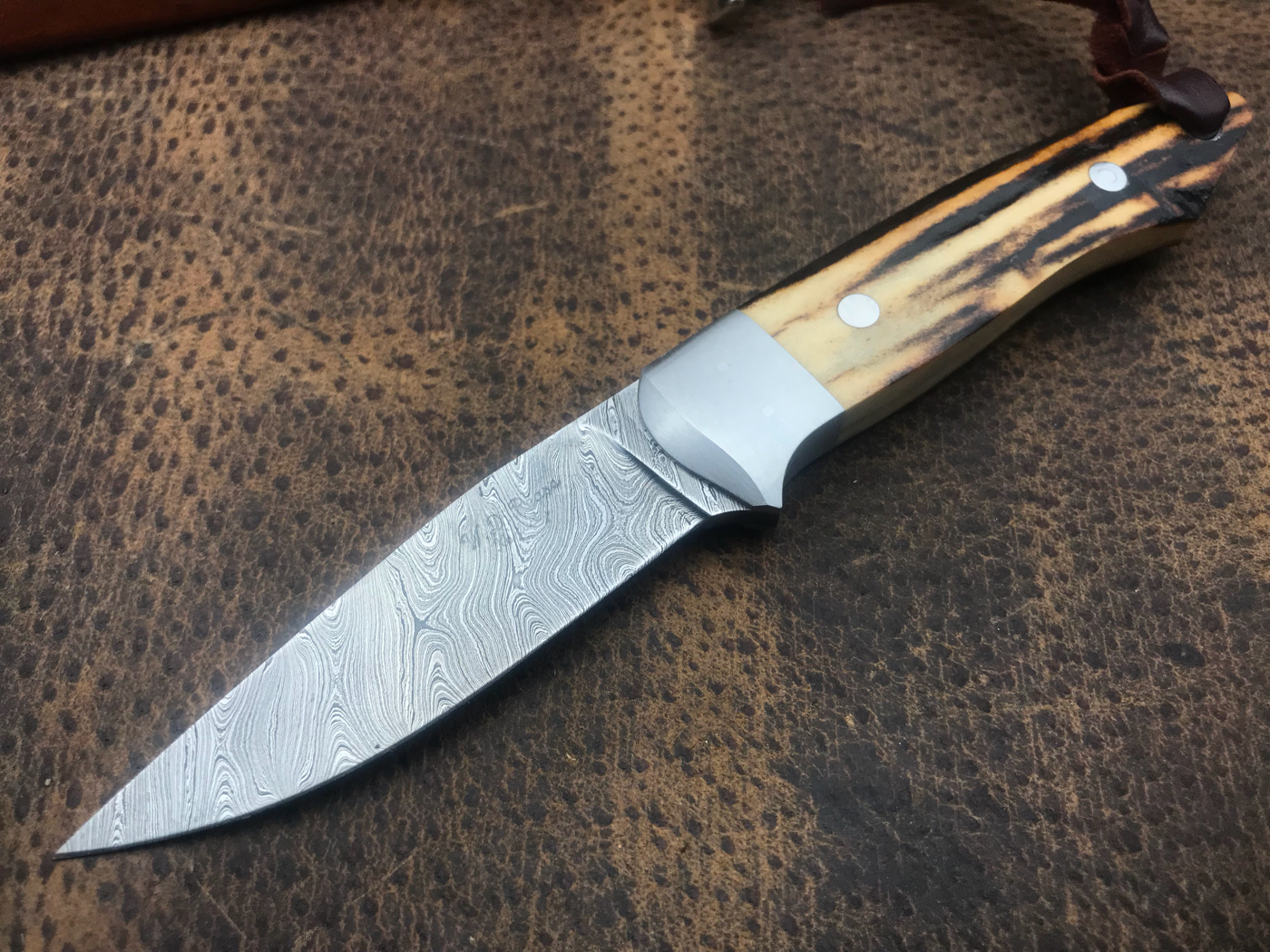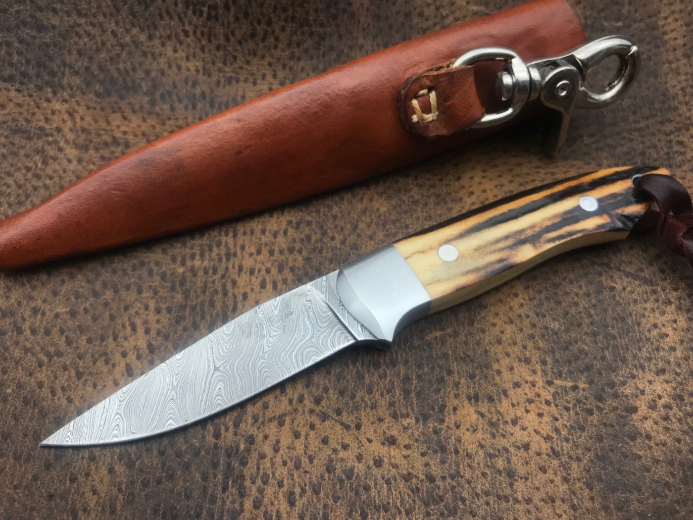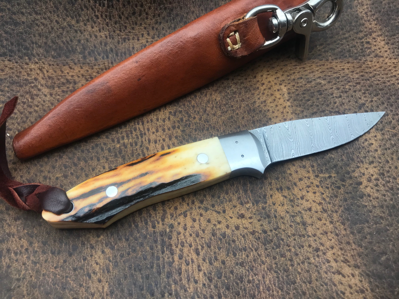 Swinger with beautiful sambar stag and stainless bolsters hollow ground damascus. This is a hidden tang. Shipping CONUS and paypal fees included. $750 sheath included