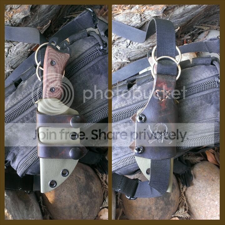Available army green foldover sheath with a 2 ring method strap postioning and a leather attachment with snaps to hold the sheath in place so it doesn't flip flop around. Made for left handed pull when wearing shoulder strap on left shoulder. Made for a 1" wide strap and can be fitted with up to a 3/16" thick strap, all hand cut 4oz. Leather stained dark brown with 24 line snaps, hand sewn and 2 stainless steel rings. Asking $70.00 shipped within USA, international shipping fees apply. PayPal, cashiers checks, cash or money orders. No 3% no extra fees only international fees. Pm me or email me with questions Jd@the710customsheaths.com