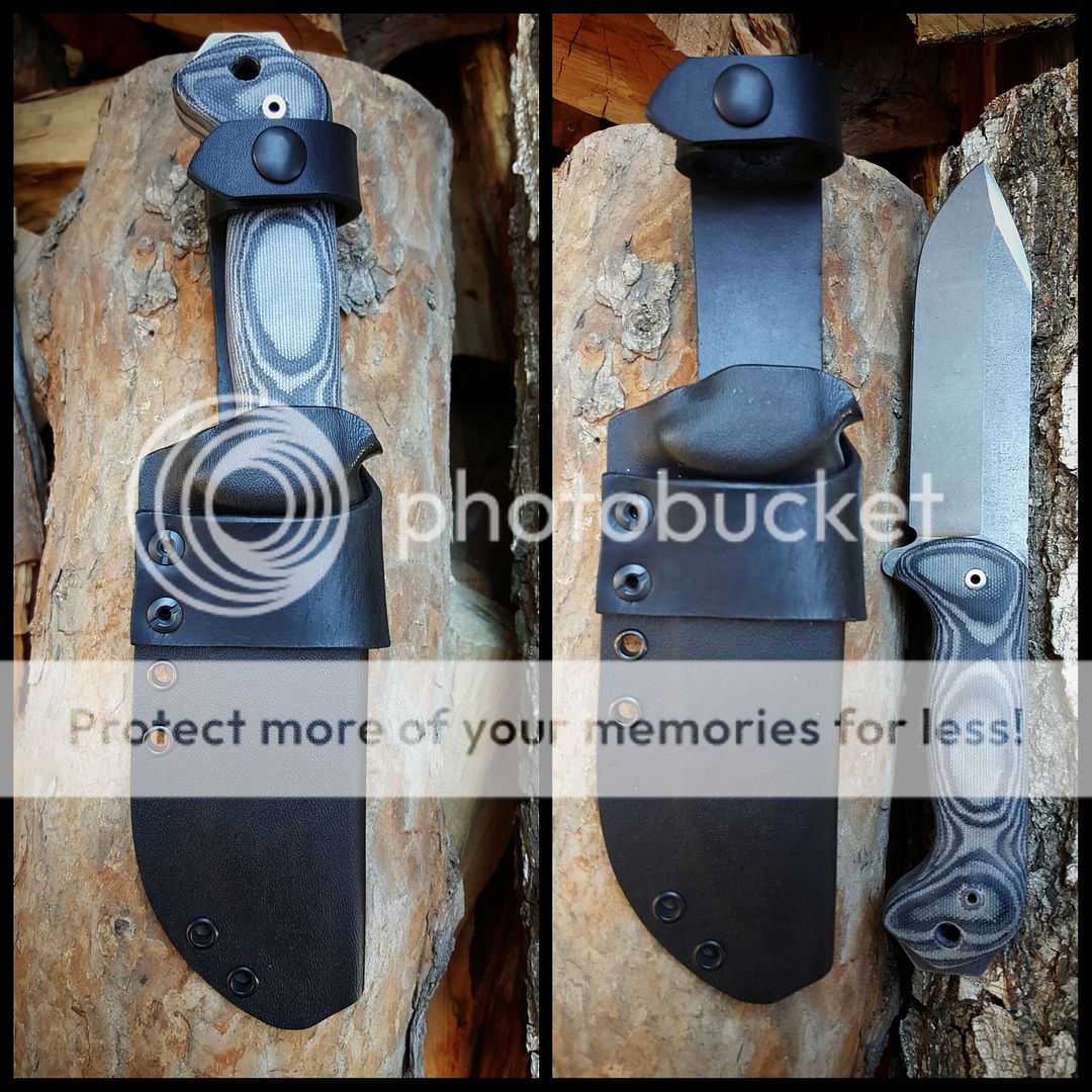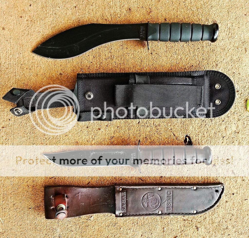 Finished up the cleanup/sharpening to my wife's uncle's KA-BAR's. The 1280 was cleaned, sharpened to a convex (knocked all the way down) around 20 degrees with a microbevel put on by stone to help it hold up against chopping, close to mirror polish. Run a similar edge on my BK9 and it does so well. Also scrubbed and water "proofed" the sheath. For those who have not gotten to play with one of these knives they are a lot of fun type of knife. It cleaned up real well... Now the KA-BAR USMC was a trouble maker... the edge was fairly well GONE, the tip was all dinged up, it had its clip sharpened, the sheath was falling apart, etc etc etc. SO! Revived the sheath with beeswax (fully impregnated) and my skull balms, then had to take it to my grinder to knock the edges back straight, I think it'll hold up now. Also gave the handle the skull balm/beeswax treatment. After that I ground the edge back into shape. Just ended up free handing it off my belt grinder and work sharp, and I resharpened the clip. Also scrubbed the coating with wax and scotchbright to give it a bit of a polish. Thing is a straight razor now and it looks a bit spiffier. Hopefully he will like what I have done... also have one of his kershaws to fix up, but its going to be a full takedown clean up kinda job...