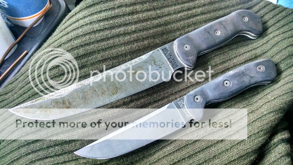 My next versions are a slimmed down Mammoth - 1/4" to 3/8" narrower, 2 leather handled Bowies for Mountain Man throwing competitions based on the Western W49 and the BK9, some smilodons with less taper to the handle, and finally some throwing stars cut out of rotary saw blades.