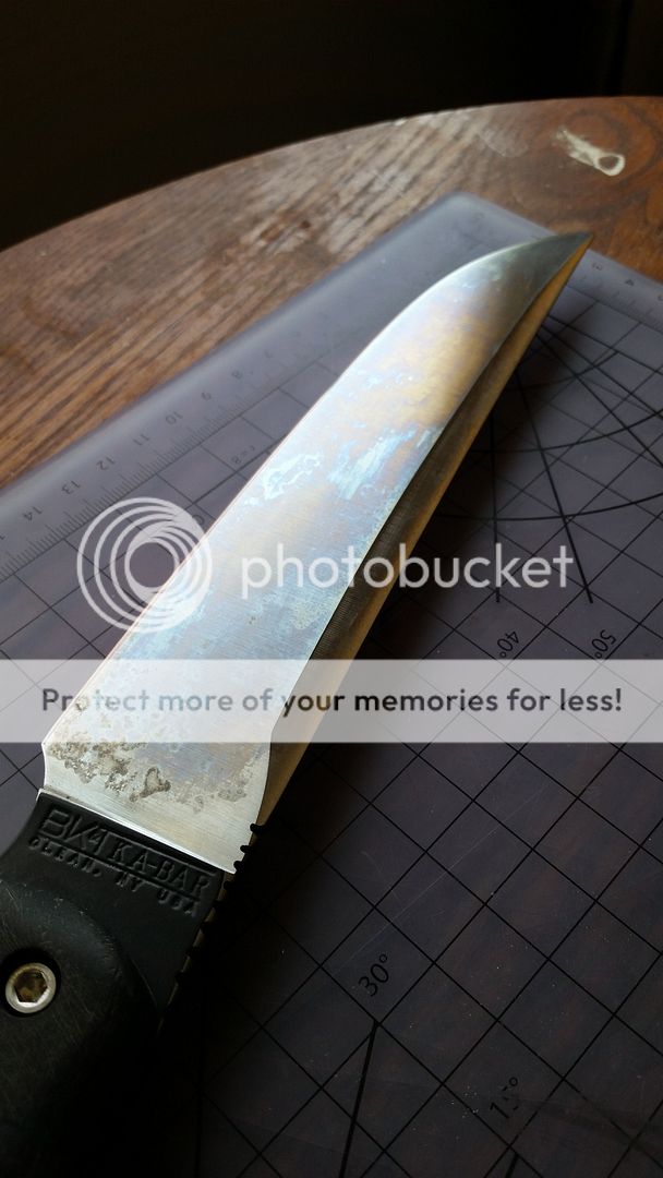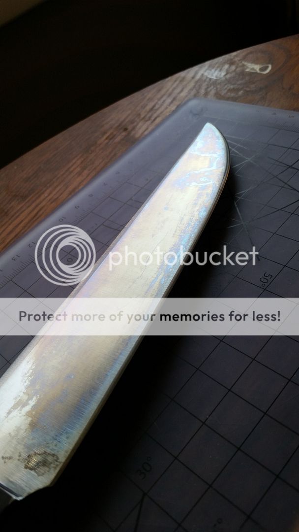 For those who were keeping score, the file knife took overnight to harden fully, which suggests to me that it's O1 or similar. It turned out wicked wear-resistant (discovered when polishing) when tempered at 1084 specs, so it's gonna be pretty sweet. That one is still in progress, but the scrap knife is done.