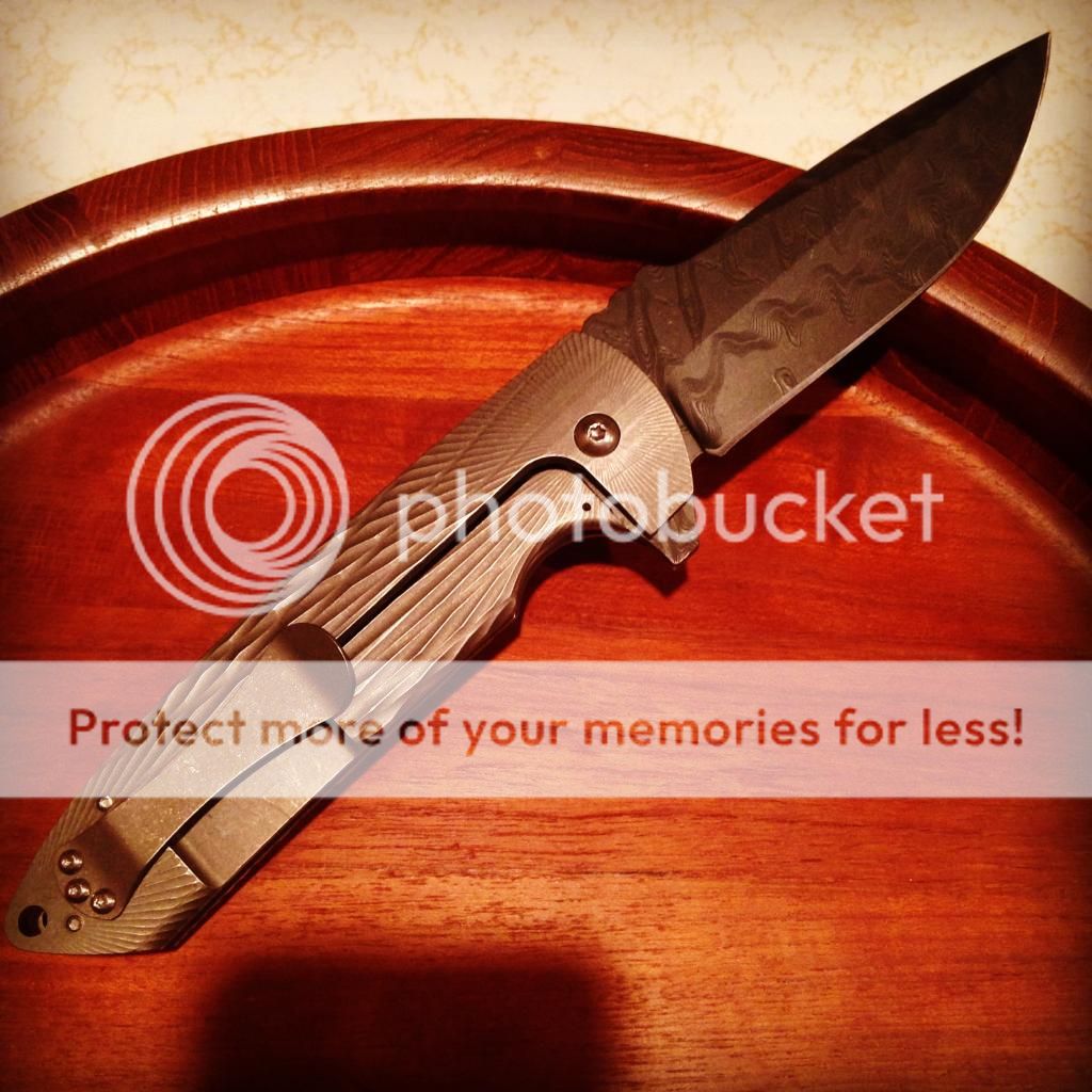 Flipper version of the Les's famed Rockeye folder. The blade has an internal stop pin for a clean look. The handle has Les's Tephra pattern 3D machined on both sides of the titanium frame. The front side features a seamless carbon fiber inlay that the pattern perfectly flows into. Blade is ground from Chad Nichols stainless damascus that has been DLC coated by Ion Bond. The Shadow Damascus looks amazing! Nichols stainless damascus is super tough, and with the DLC coating, this is a dress knife that can still be used hard! Flips great and is so smooth!!