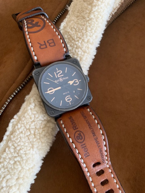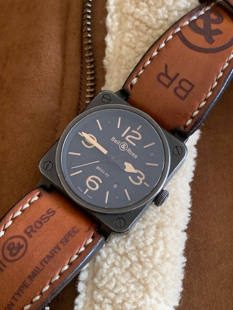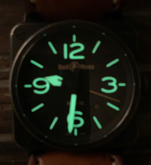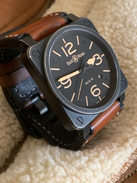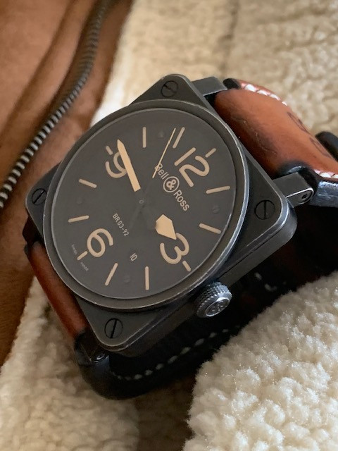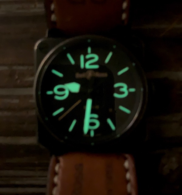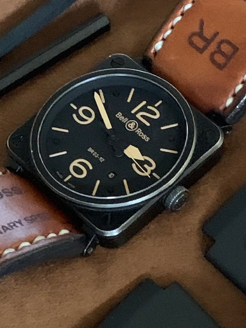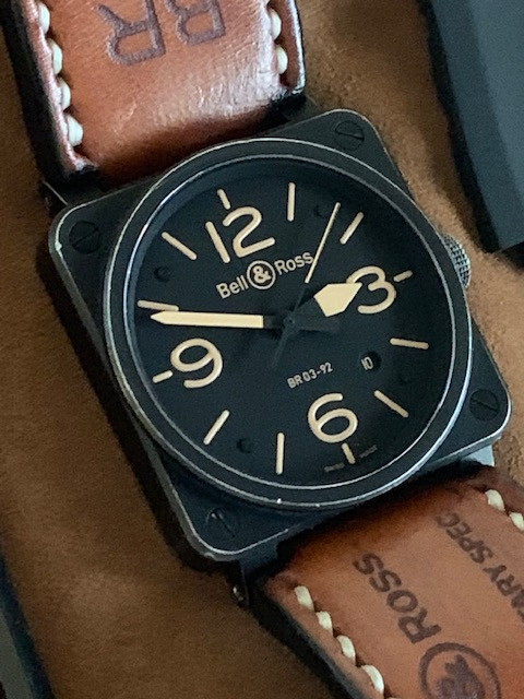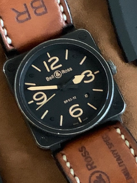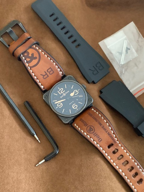 This is the 42 mm steel version (which is a lot easier to wear than its bigger brother IMHO) of Bell & Ross; it has been worn as you can see. No, it is not a safe queen. It has a beautiful "aged" look all around, except the crystal which is in excellent shape. It comes with its spare rubber strap, strap changing tools and the bars. No boxes or papers.
