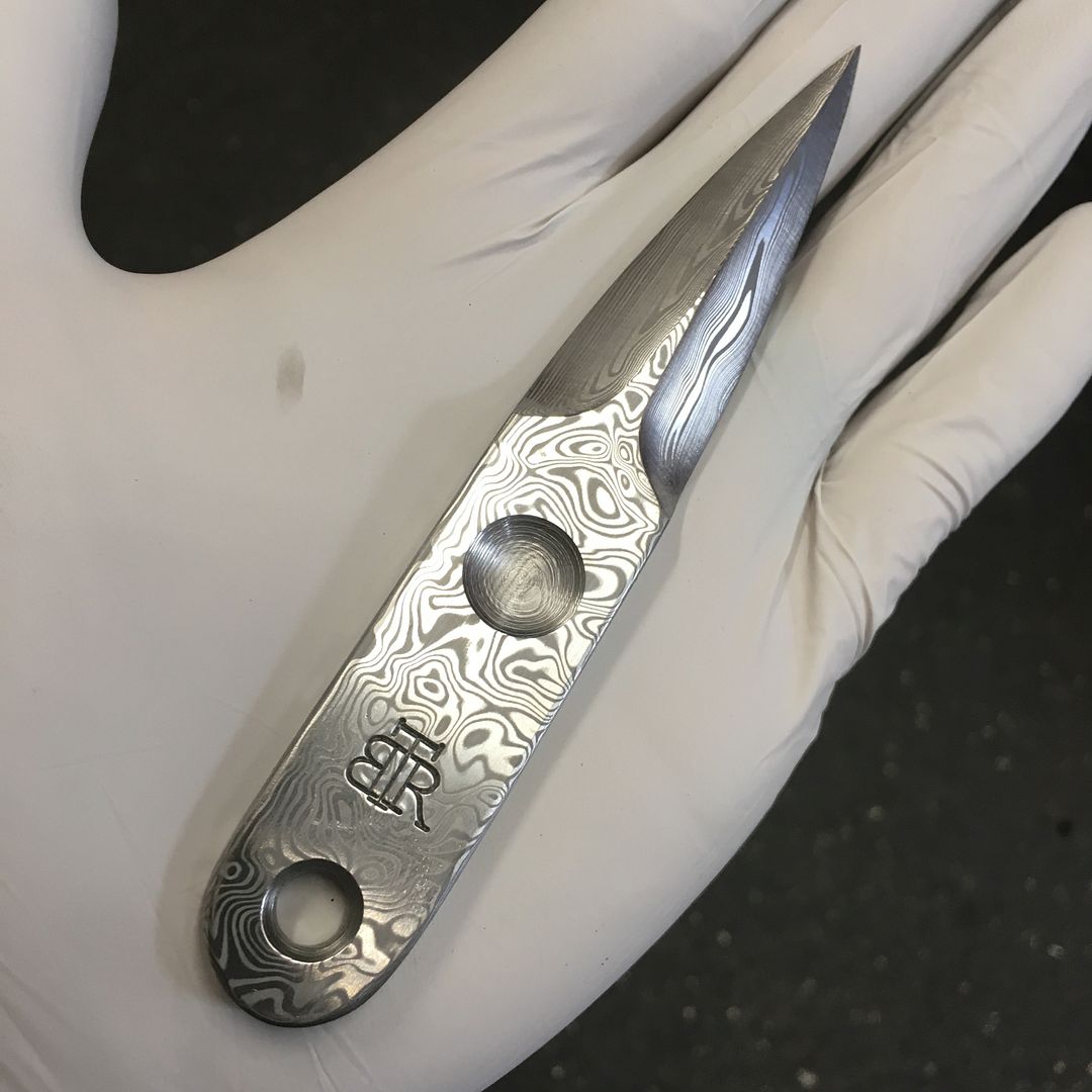I sent Ben a nice bar of Vinland pattern Damasteel for the project and he just sent me the photos of the beginning of the build. There was enough Damasteel to also make two of his OSS daggers in different sizes.