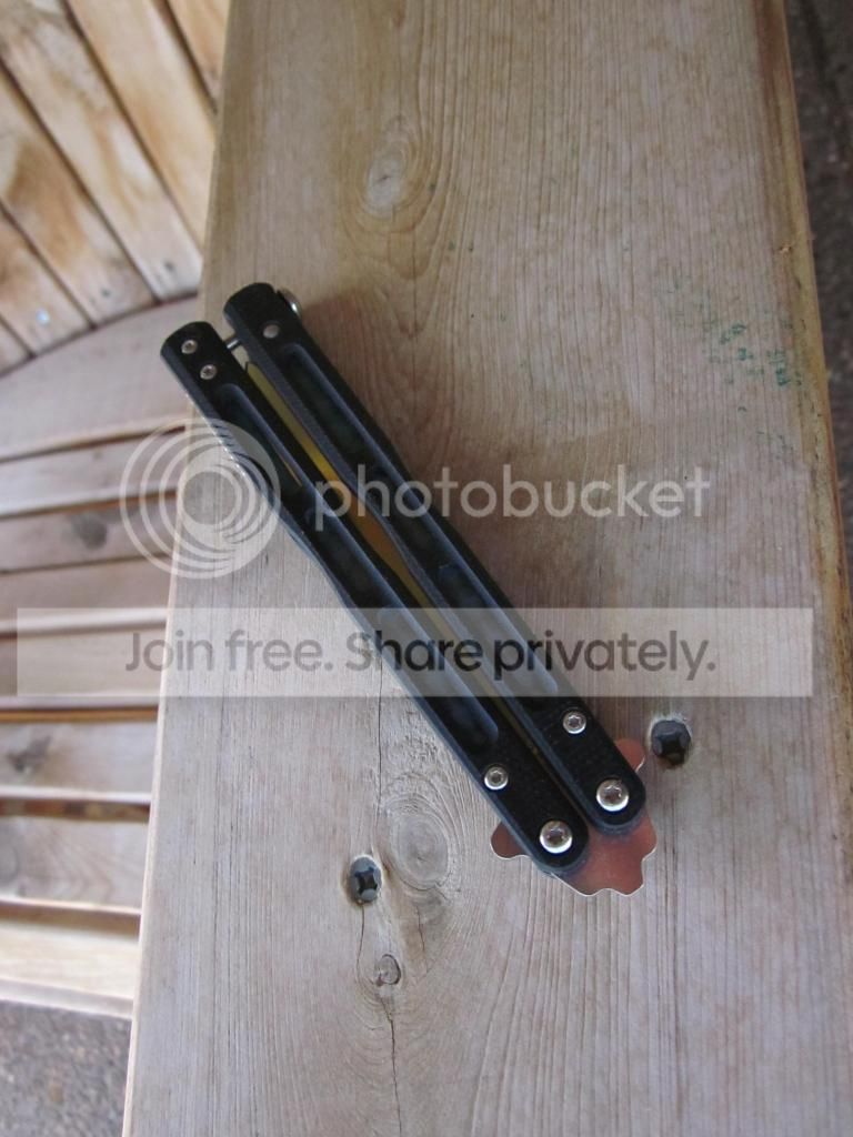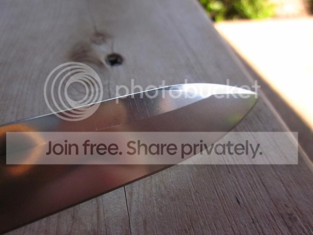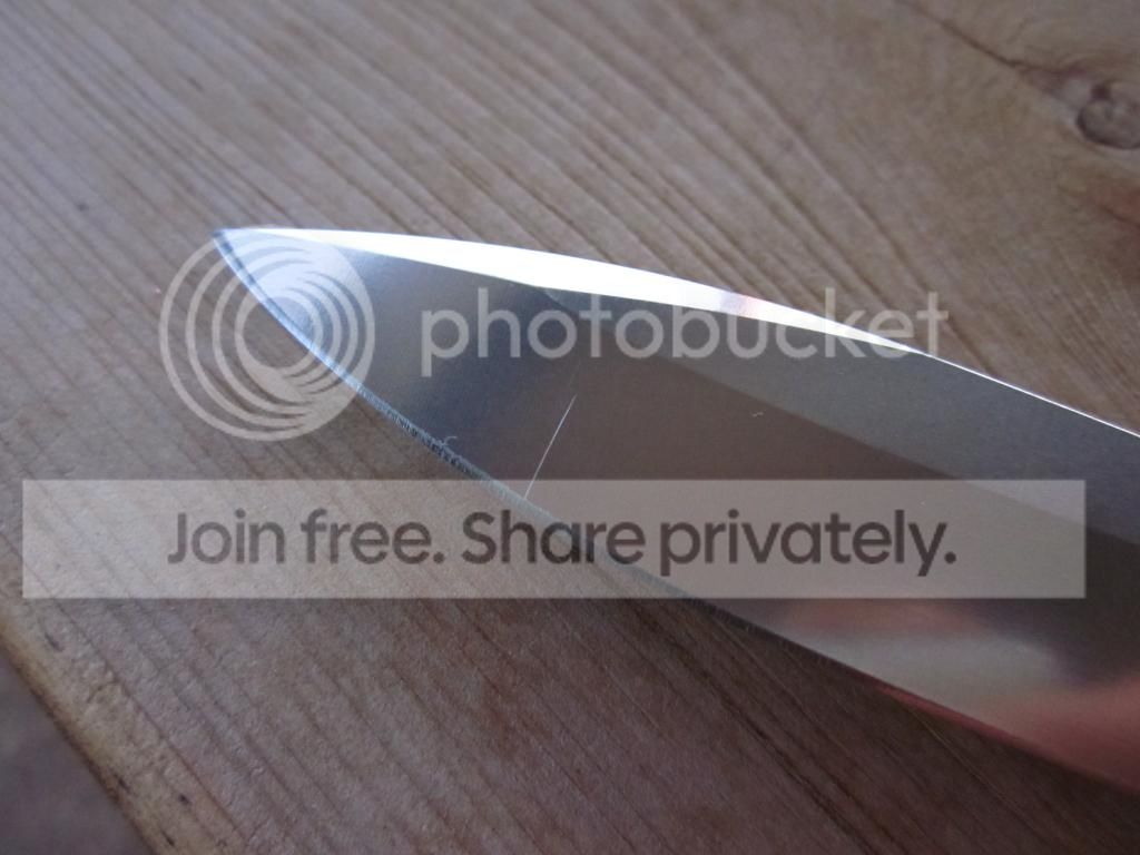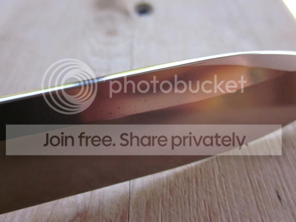 The blade has one scratch towards the belly and a few small ones on the other side as well as a few tiny spots of oxidization that is no longer a problem but the spots are still there. All the body screws have been loctited. The knife really flips nicely and carries nicely if you're not a flipper. It's not very sharp right now because I didn't want any severed digits if I screwed up a move so I left it stock. I will sharpen it on my EP on request.
