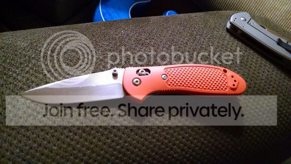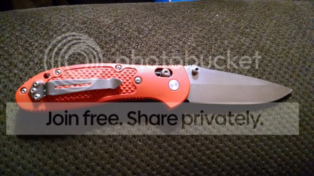 I have had and used this knife for a while now and have moved on to a mini grip. The knife functions perfectly. Blade steel is the N680 version. The knife has been sharpened and the blade has some scratches and scuffs. The handles have some dirt on them that can be easily cleaned with a toothbrush. One of the screws on the side where the handles fasten to the liners is somewhat stripped. The printing on the blade did not last long and it is almost completely unreadable. Still a great user. CONUS and PayPal only and I cover all fees and shipping.