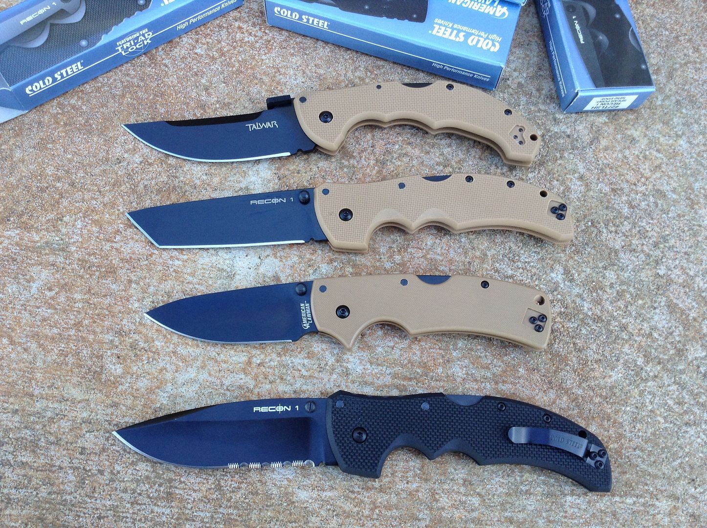 Here I have several NIB Cold Steel Knives for sale. All are new in the factory box with the extra pocket clips. The 3 coyote tan G10 models are limited edition (Talwar large 4", Recon 1 Tanto large 4", and American Lawman) are the newest CTS-XHP and are $70 each shipped. ---RECON 1 & AMERCIAN LAWMAN SOLD---The black handle Recon 1 spear point is AUS8a and priced at $45 shipped.