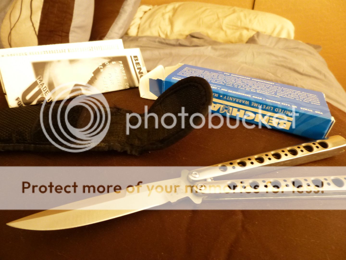 Hi I'm selling my BM42 T-Latch with everything for 435.00 shipped and pp fees included. Pay Pal only please. its in immaculate condition for its age and has everything it came with. I bought it in 2000 at the Cutlery Shoppe in the mall, I was tired of those cheap $20.00 butterfly knives falling apart when your flipping them. I decided to bite the bullet and shell out the dough for a nice one and that's why I kept everything it came with. I played with it gently and always kept it in the sheath at all times when it wasn't in use and never has been dropped or abused. After a year I turned 21 and got into guns and other toys and forgot about it. Its been tucked in my safe for 15 years now, you wont be dissapointed. Thanks for looking. Ill try to keep adding pics. First "I'll take it" followed by a pm takes it. Donny