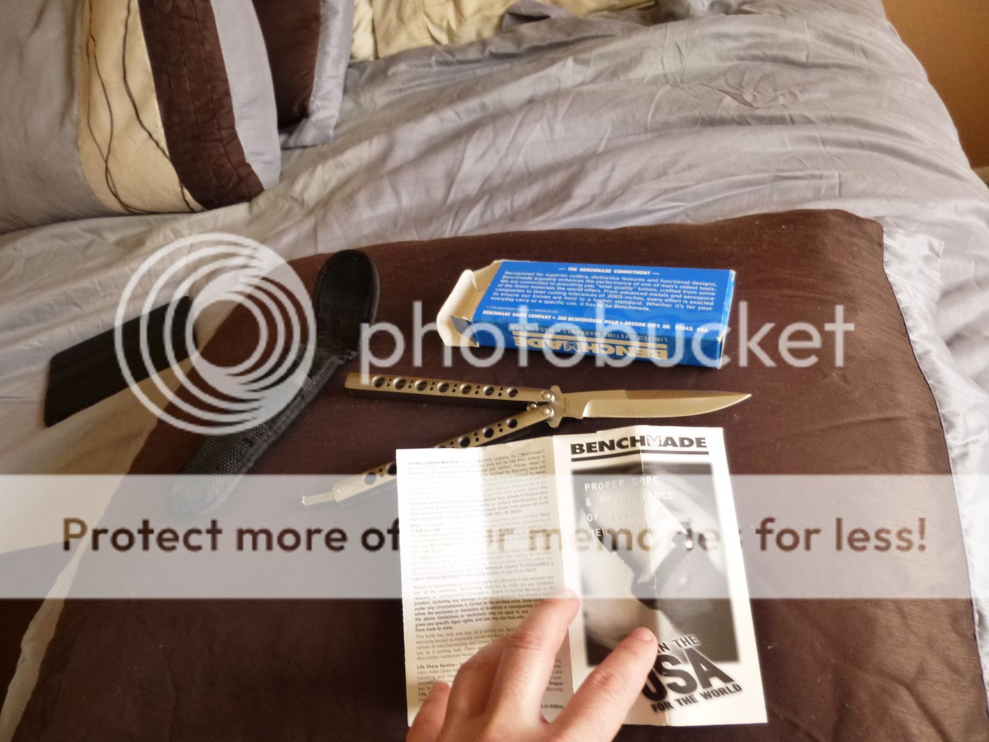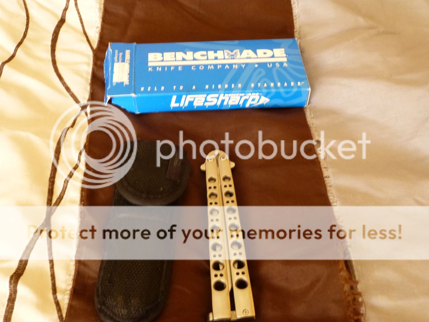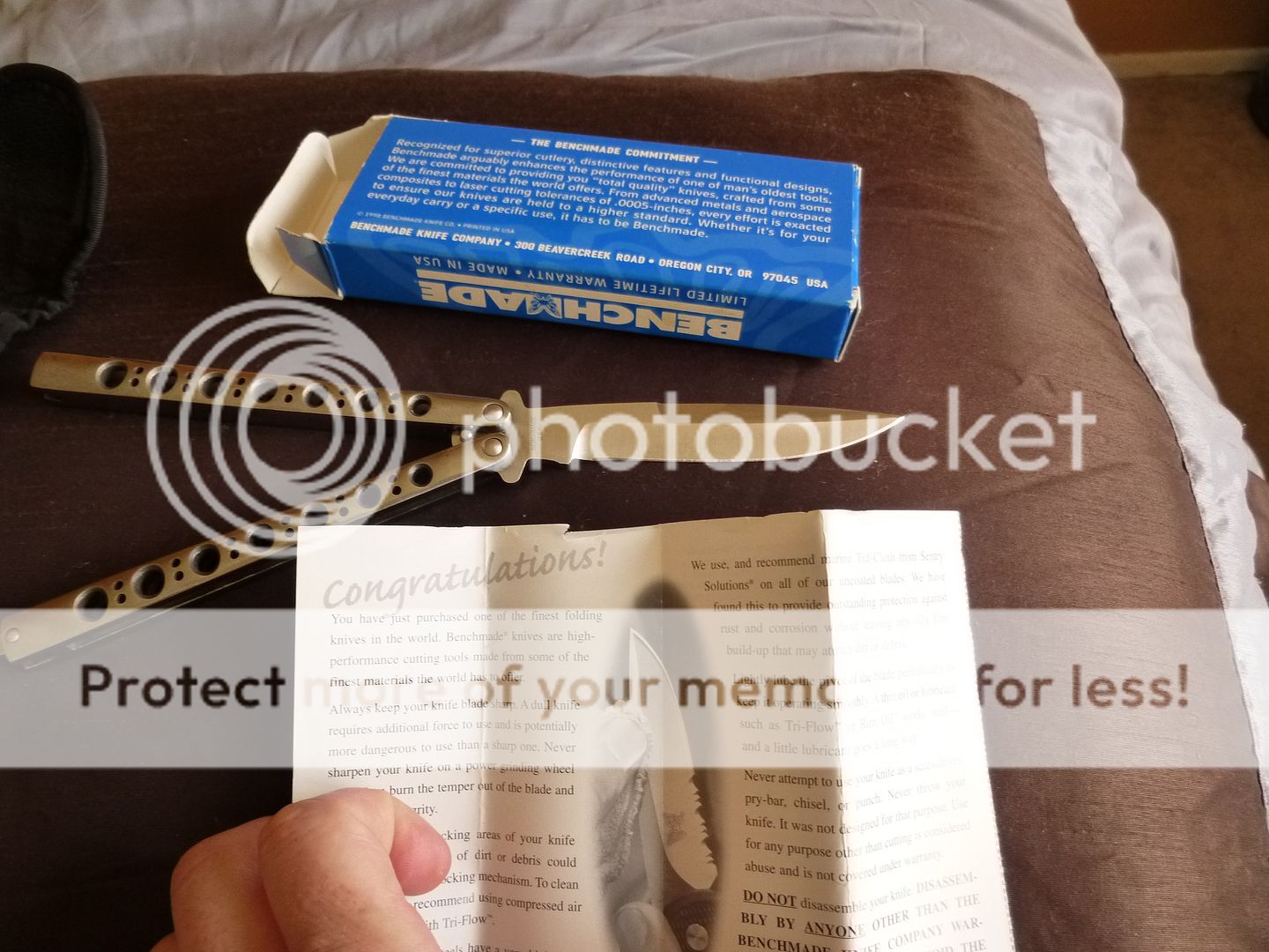 Hi I'm selling my BM42 T-Latch with everything for 435.00 shipped and pp fees included. Pay Pal only please. its in immaculate condition for its age and has everything it came with. I bought it in 2000 at the Cutlery Shoppe in the mall, I was tired of those cheap $20.00 butterfly knives falling apart when your flipping them. I decided to bite the bullet and shell out the dough for a nice one and that's why I kept everything it came with. I played with it gently and always kept it in the sheath at all times when it wasn't in use and never has been dropped or abused. After a year I turned 21 and got into guns and other toys and forgot about it. Its been tucked in my safe for 15 years now, you wont be dissapointed. Thanks for looking. Ill try to keep adding pics. First "I'll take it" followed by a pm takes it. Donny