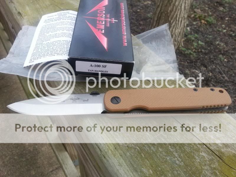 Emerson A-100 SF Tan Handles This is a LNIB Emerson A-100. Never carried or used...nice knife and is PERFECT. Has original box, baggie and paperwork. $SOLD shipped to your door. (posting pics shortly)