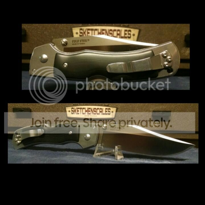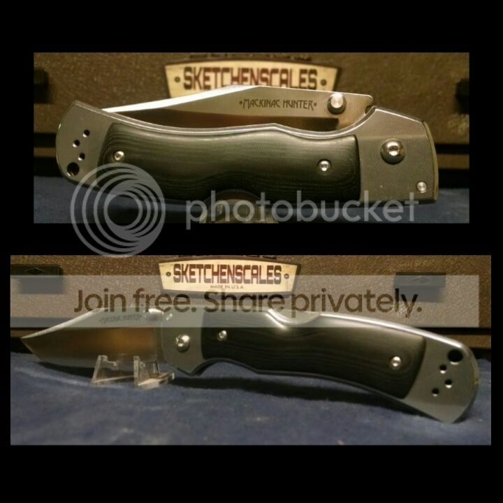 LNIB Cold Steel Mackinac Hunter (54FBT), thumb stud version, AUS8. I replaced the horrendous stock scales with very nice aftermarket scales from sketchen -- polished black linen micarta. Theyve made the knife quite the looker, IMO. Steve does outstanding work. Very well centered, no blade play at all. Never carried, factory edge. Box, paperwork, and factory scales included. Pics posted with Steve's permission (spketch).
