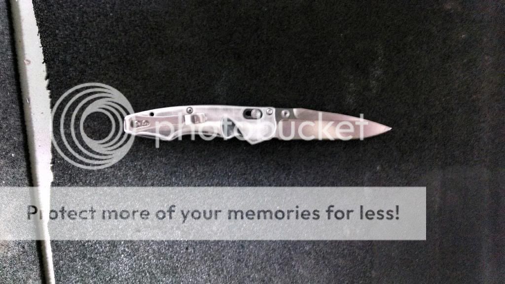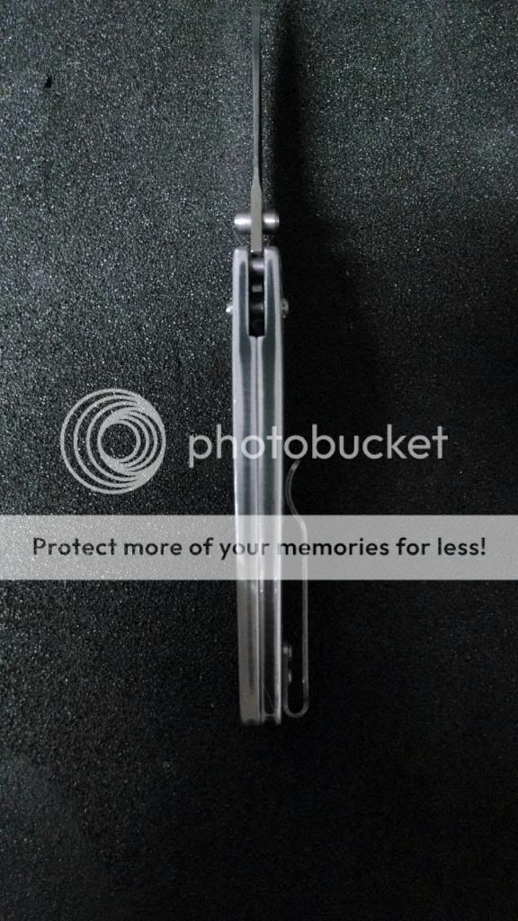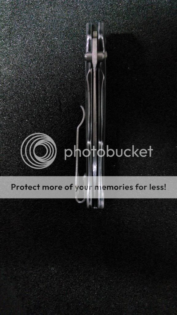 This one would make a great beater or project knife. It came coated with some kind of spray paint, and stripping it revealed a previous owners poor attempt to remove the anodizing. There is moderate blade play in both directions but I have no doubt that the lock is secure. Blade is centered.
