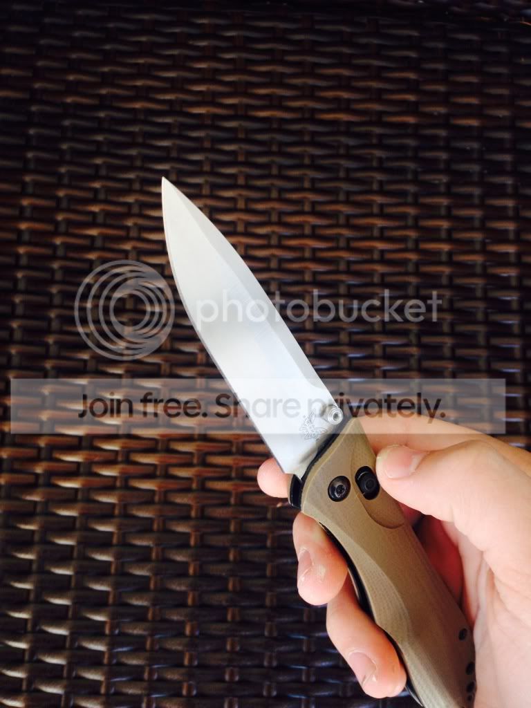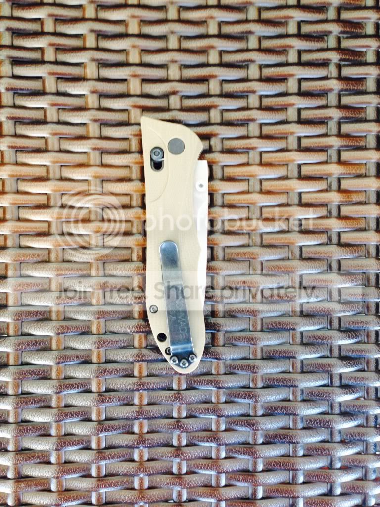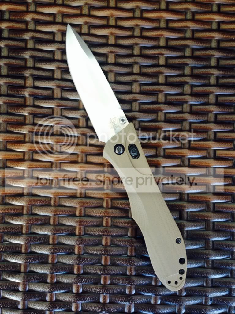 Today for trade I have a BM 730-1303 Ares. I kind of don't want to get rid of it, but it doesn't get carried much since I have my Adamas. It has S30V steel, tan G10 and is number 229 of 300. Only thing wrong with it is a small scratch on the non presentation side of the blade. Clip is also a little beat up. You can always just ask BM for a new clip. Comes with box, papers and I believe it has the little nylon baggie.