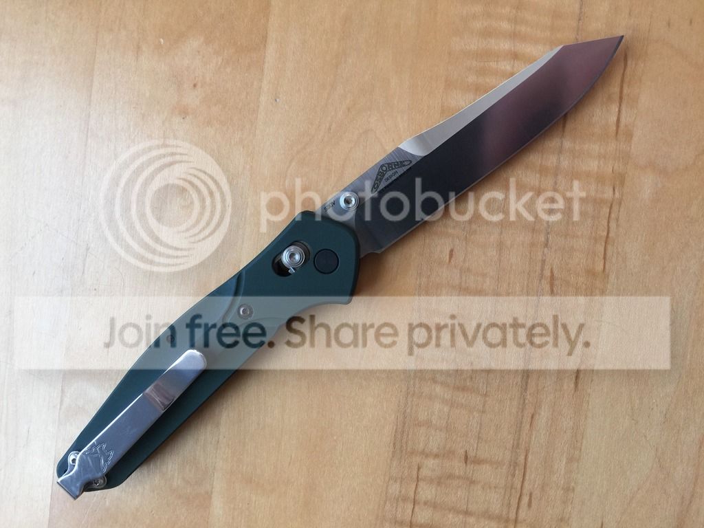 Up for sale is my gently carried and used 940. It has the satin, PE blade and is currently set up with a polished low ride clip. It comes with the original Emerson-style black clip, box, bags and paperwork. Very, very little wear on the scales and and a few scuffs on the clip. Blade is slightly off center, but action is brilliant - free falls when the Axis lock is released with no blade play. Edge is screaming sharp. Asking $155 shipped CONUS. I prefer Paypal and will eat the fees. **SOLD**